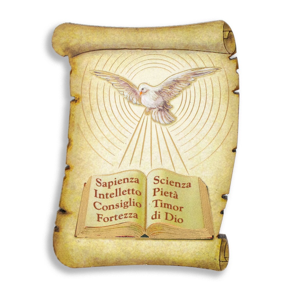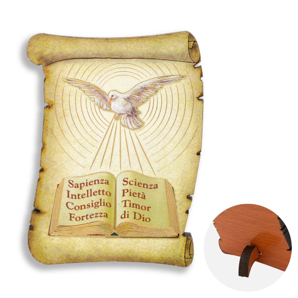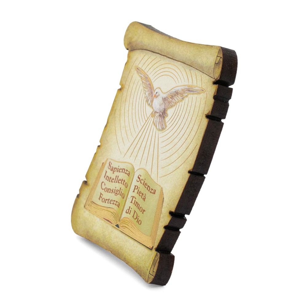 Mini quadretto a forma di pergamena in MDF con immagine stampata della colomba e i 7 doni dello Spirito Santo.