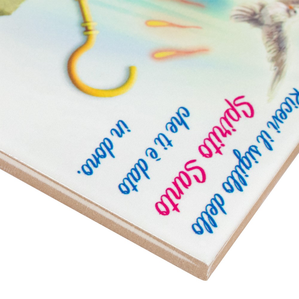 La piastrella è in ceramica di Sassuolo, finemente decorata e munita di nastrino bianco per essere appesa.