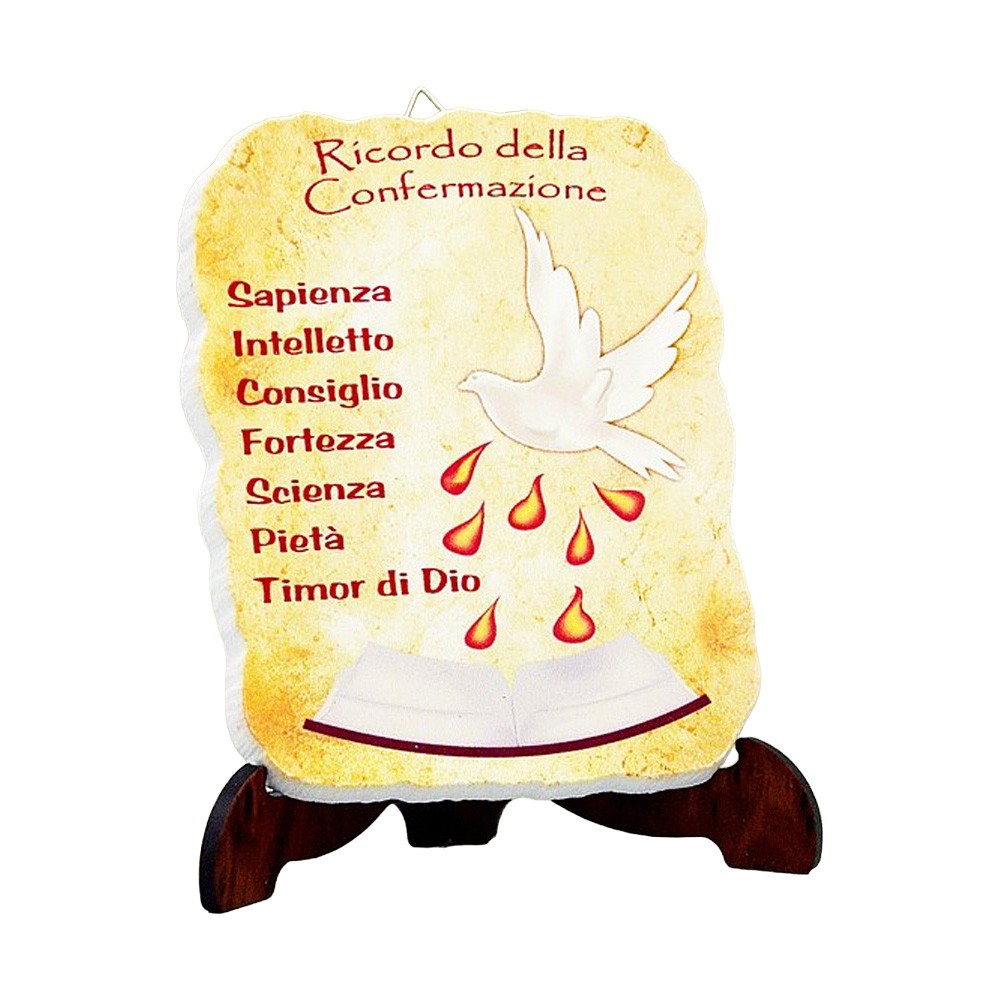 Quadretto pergamena con immagine a stampa raffigurante i simboli del Sacramento della Cresima. Il quadretto è corredato di piedino e triangolino in metallo. Ottima idea regalo per il Sacramento della Cresima. Scatolato.