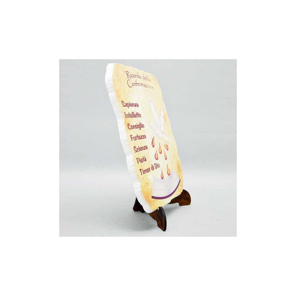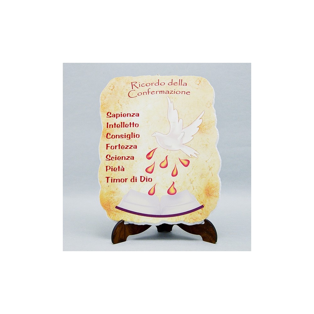 Quadretto pergamena con immagine a stampa raffigurante i simboli del Sacramento della Cresima. Il quadretto è corredato di piedino e gangio in metallo. Ottima idea come bomboniera per il Sacramento della Cresima. Scatolato.