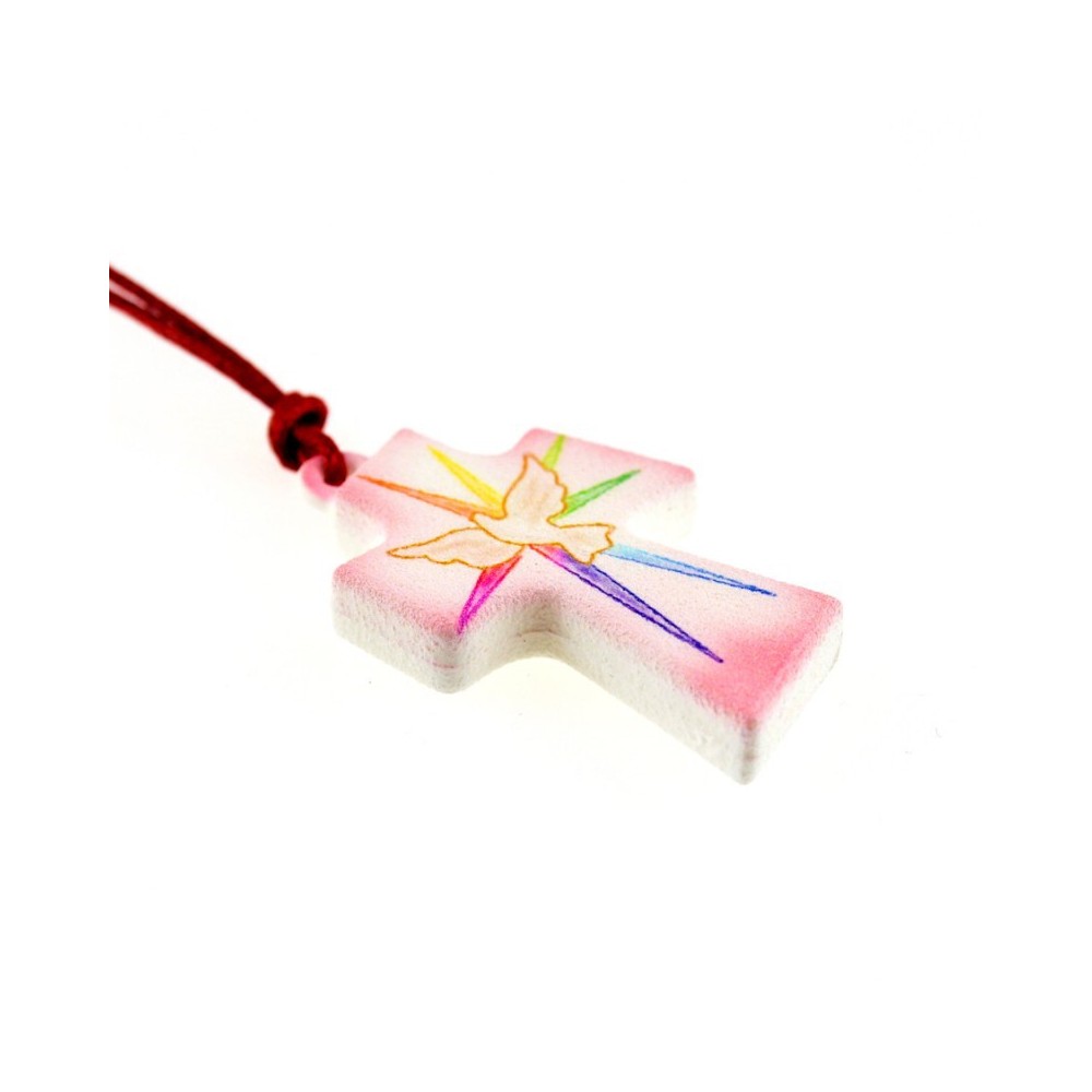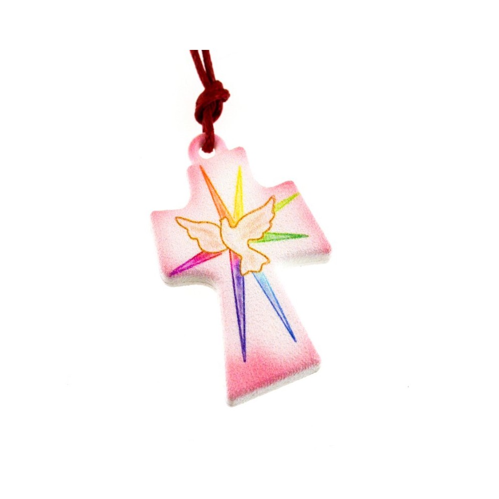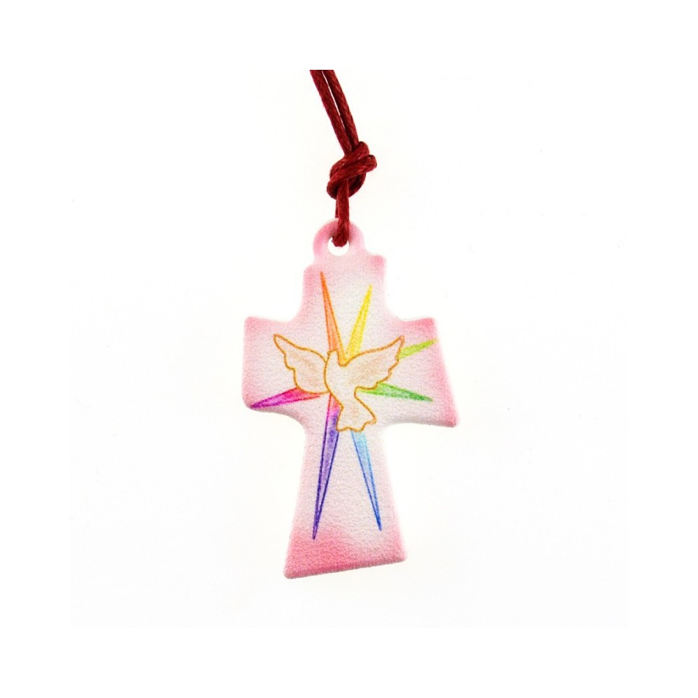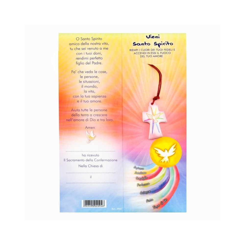 Croce pendente Spirito Santo con laccetto e cartoncino.