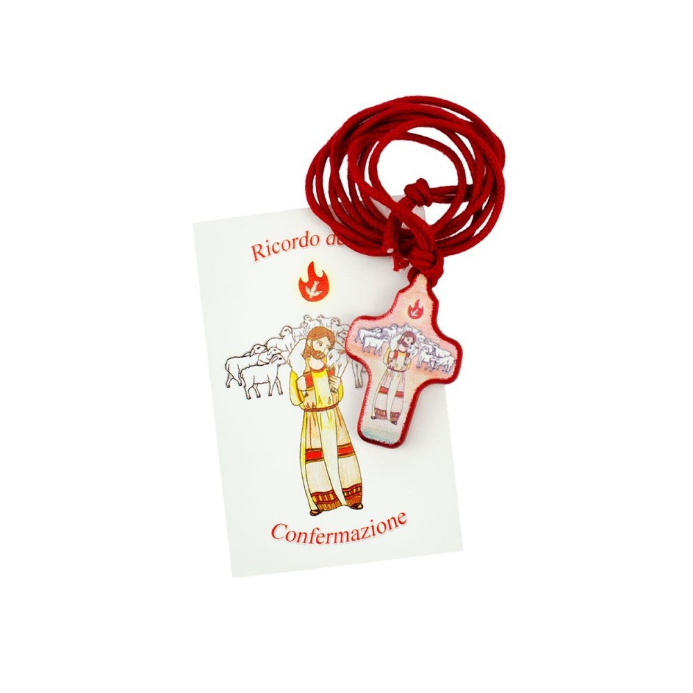 Ciondolo Croce " Buon Pastore" con laccetto e bigliettino ricordo Santa Cresima.