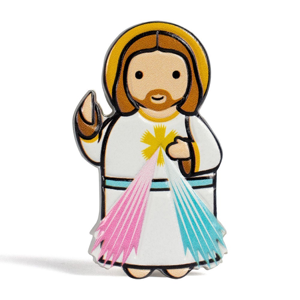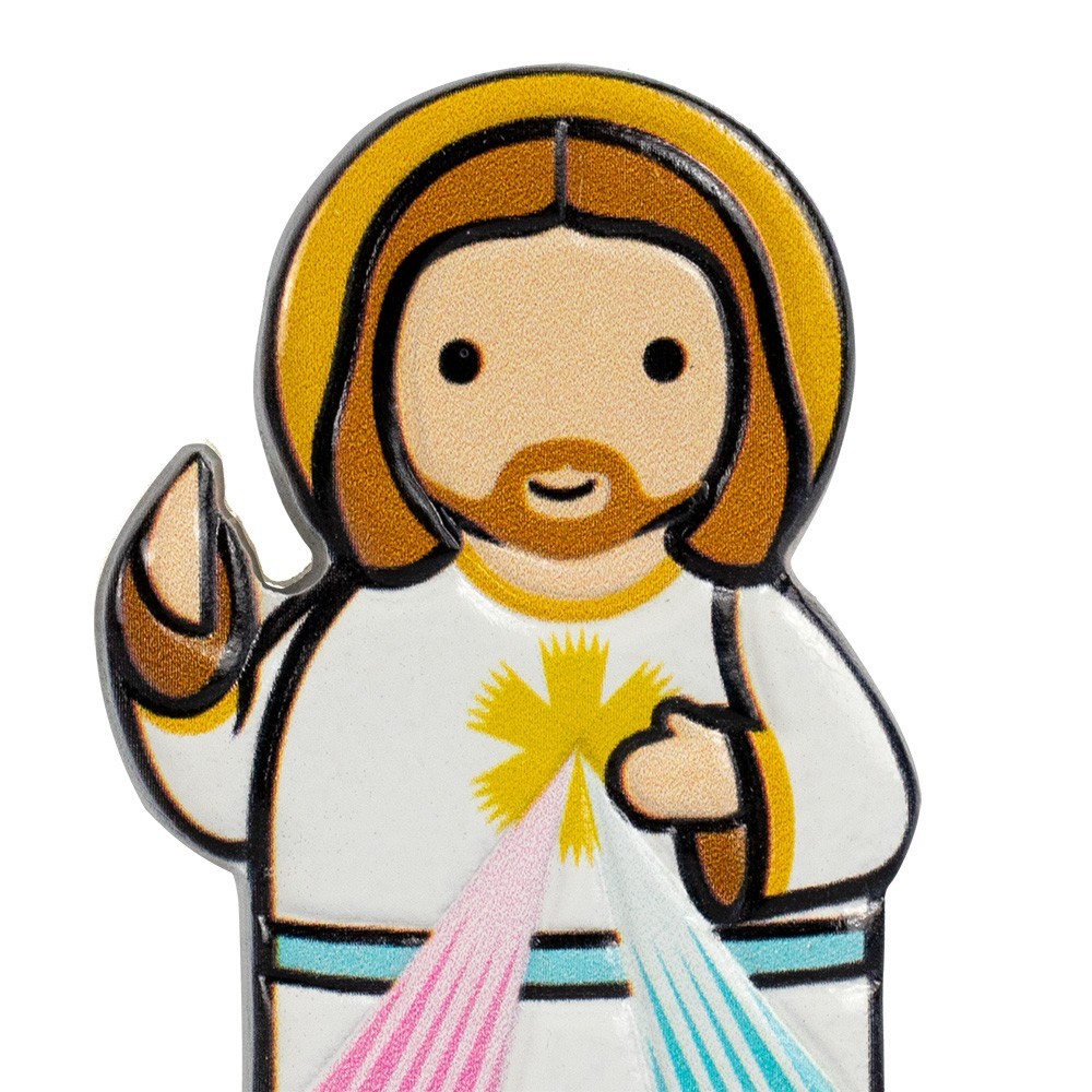 Magnete con sagoma di Gesù Misericordioso. La calamita è realizzata in resina colorata, confezionata in bustina trasparente assieme ad un cartoncino con preghiera alla Divina Misericordia.
