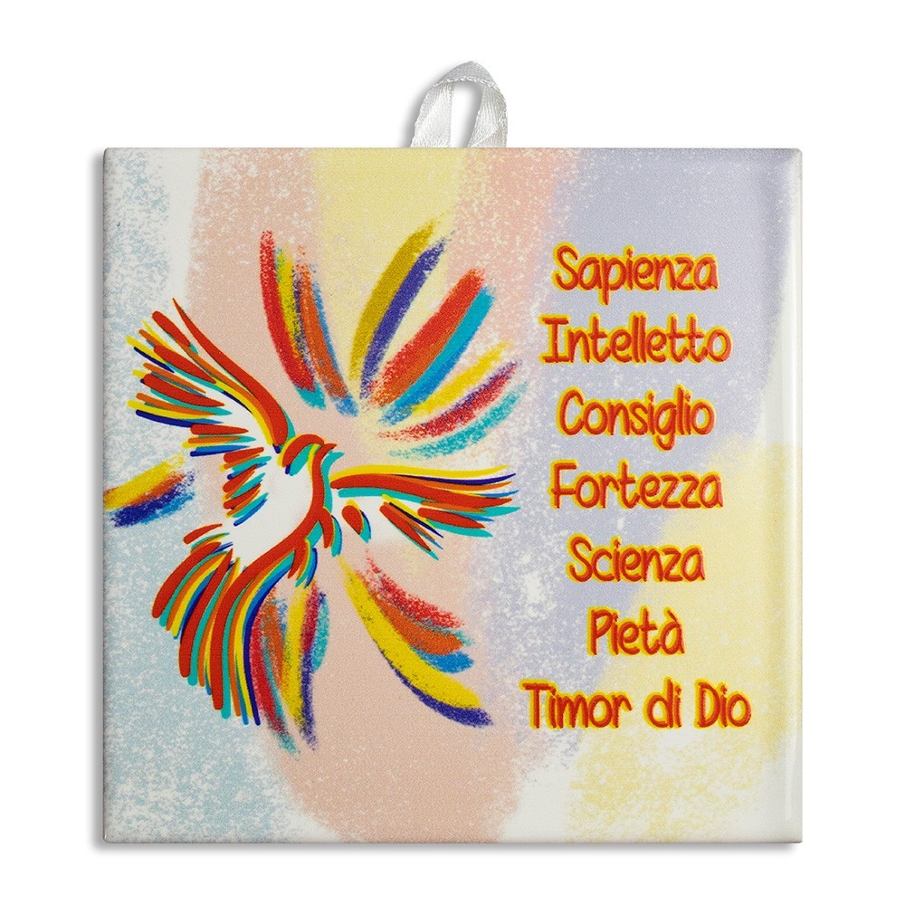 Tavoletta in ceramica per la Cresima. Completa di nastrino bianco per poterla appendere. Sul quadretto vi è l'immagine stampata raffigurante lo Spirito Santo e i sette Doni (Sapienza, Intelletto, Consiglio, Fortezza, Scienza, Pietà e Timor di Dio). Ideale come ricordino o bomboniera per la Cresima