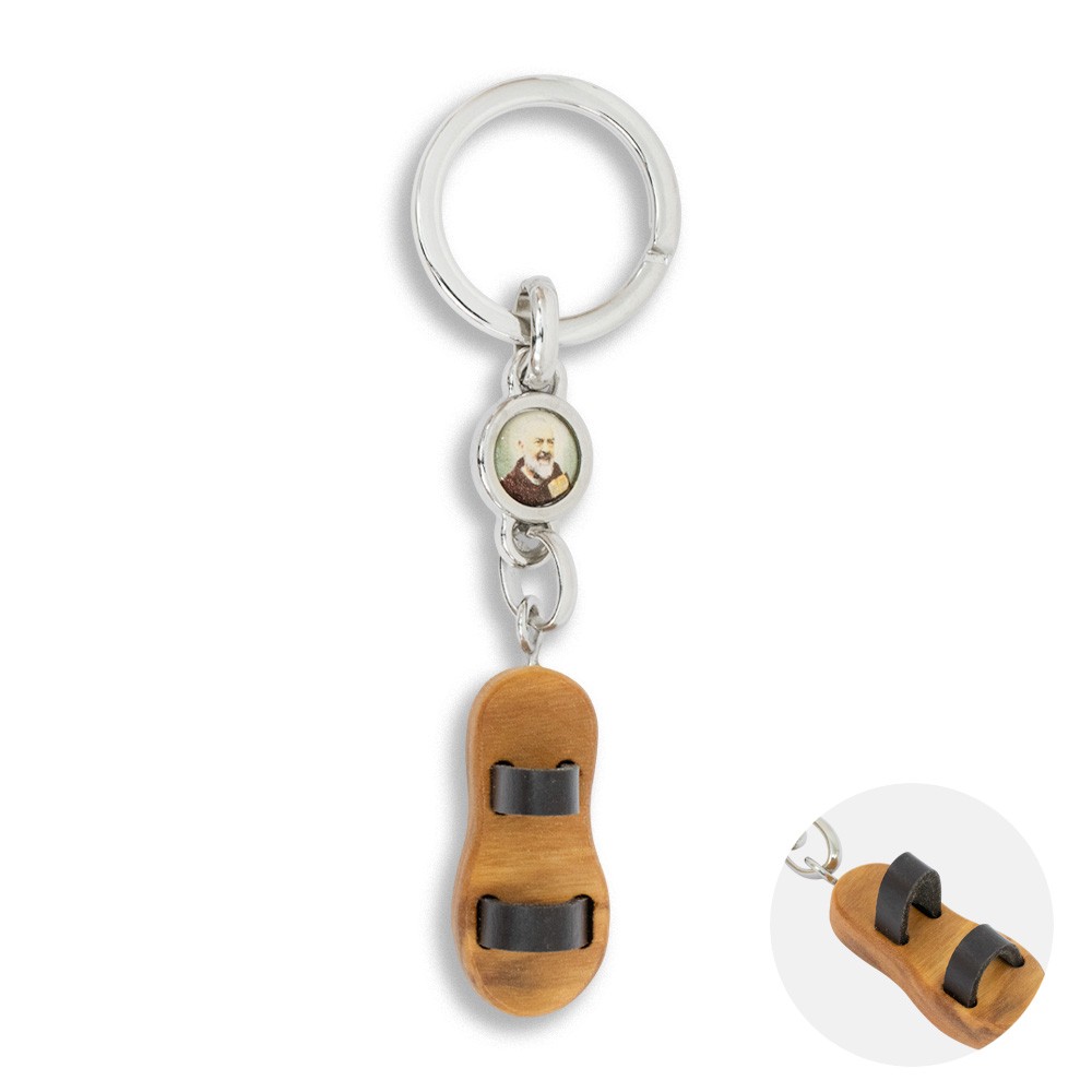 Portachiavi con sandalo francescano in legno di ulivo e fascette in pelle nera, completo di medaglietta di San Pio