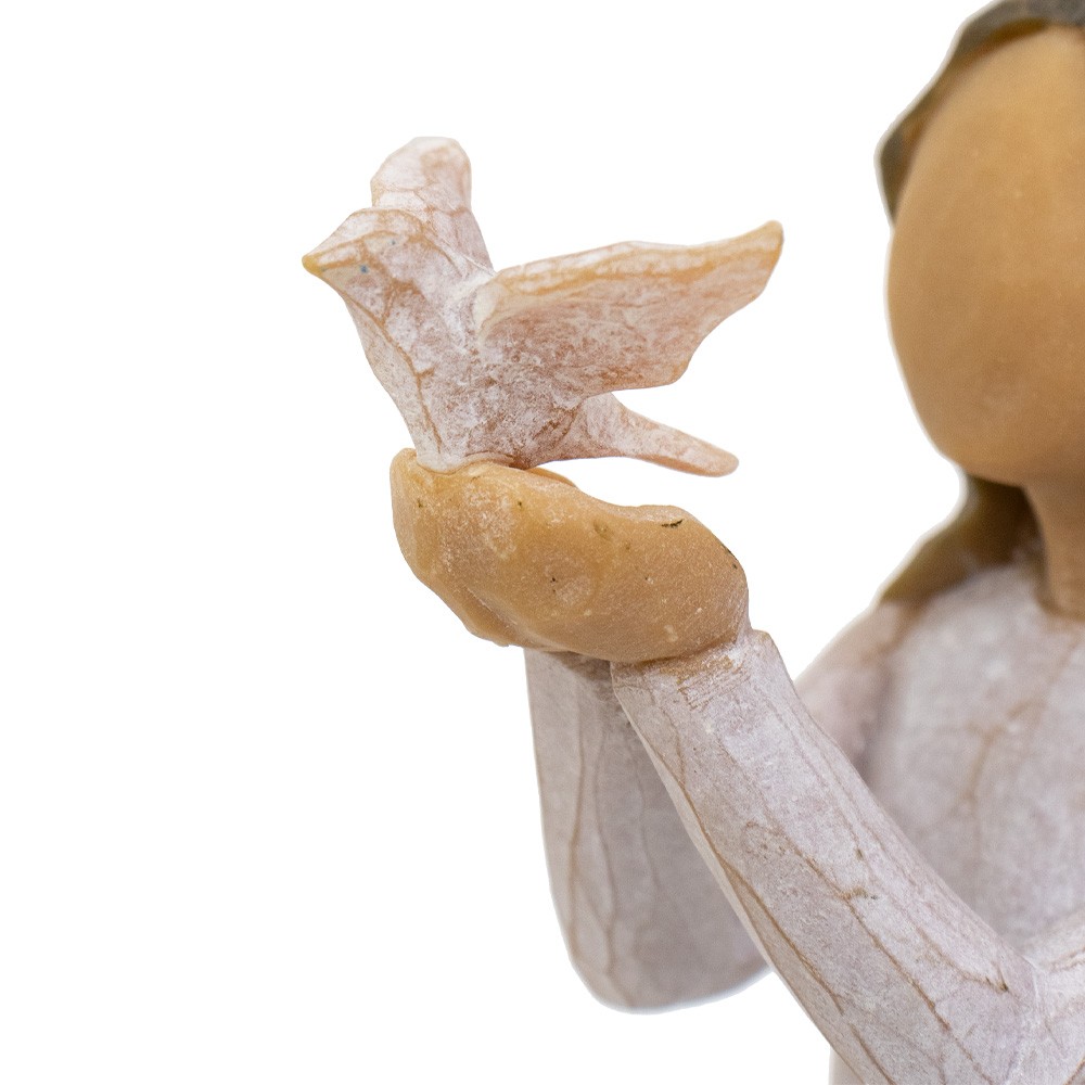 La scultura raffigura una bambina con lo sguardo rivolto verso l'alto che innalza una colomba. Realizzata in resina con colorazione effetto legno, intagliata e dipinta finemente a mano.