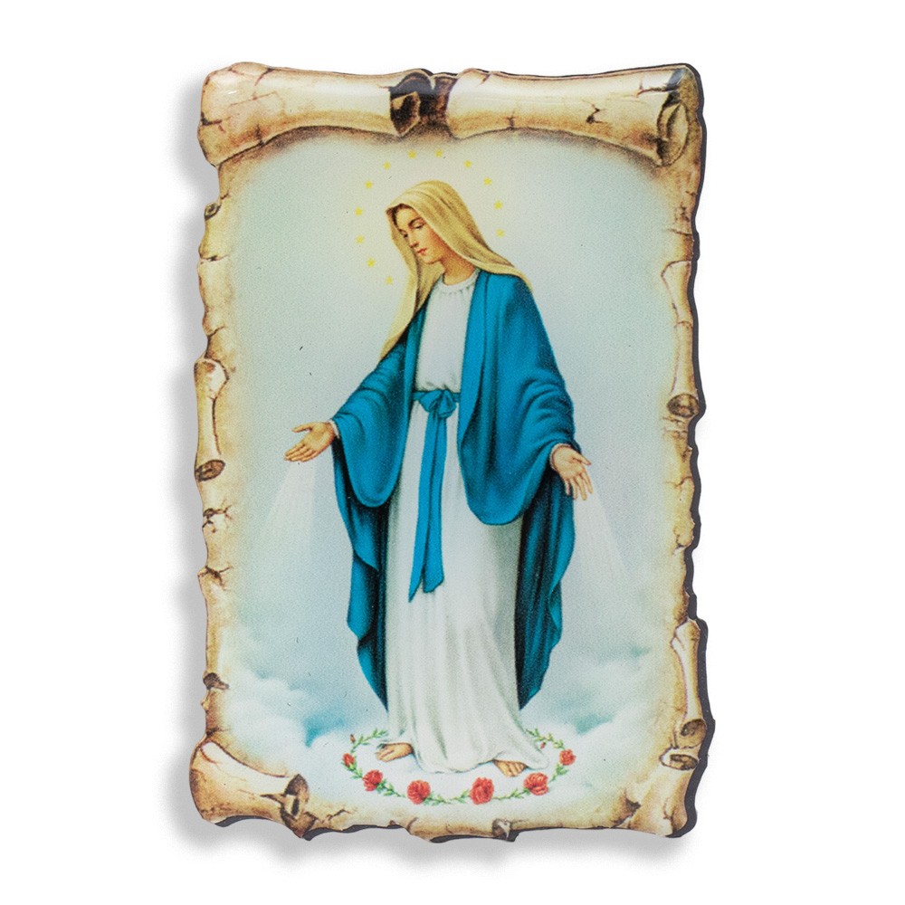 Magnete sagomato a forma di mini pergamena resinata con immagine decorata di Madonna Miracolosa.
