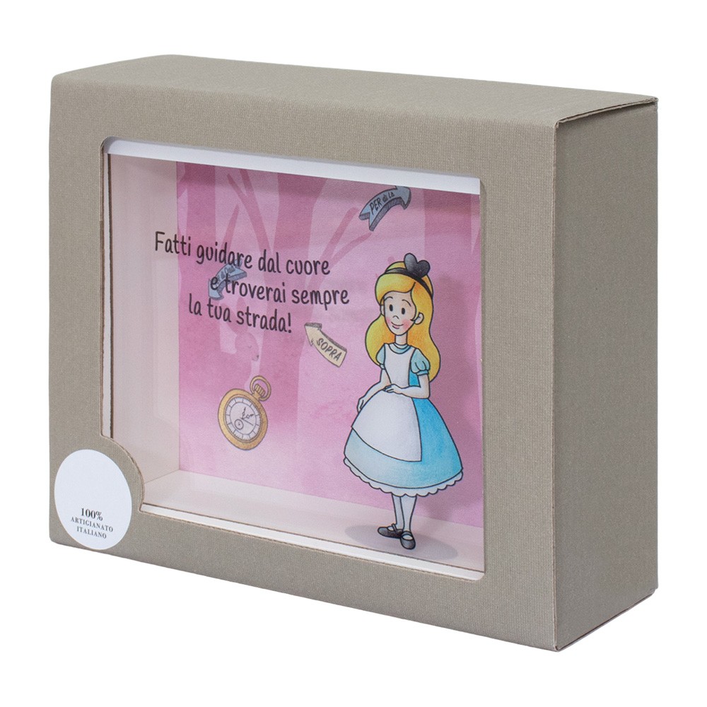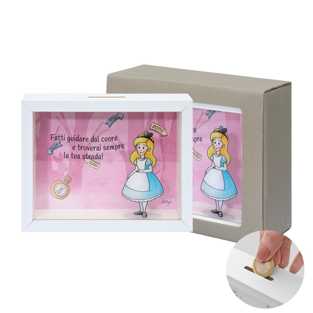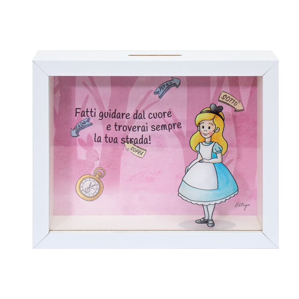 Salvadanaio in legno e vetro con decoro Alice nel Paese delle Meraviglie su fondo rosa.