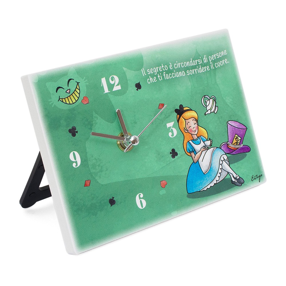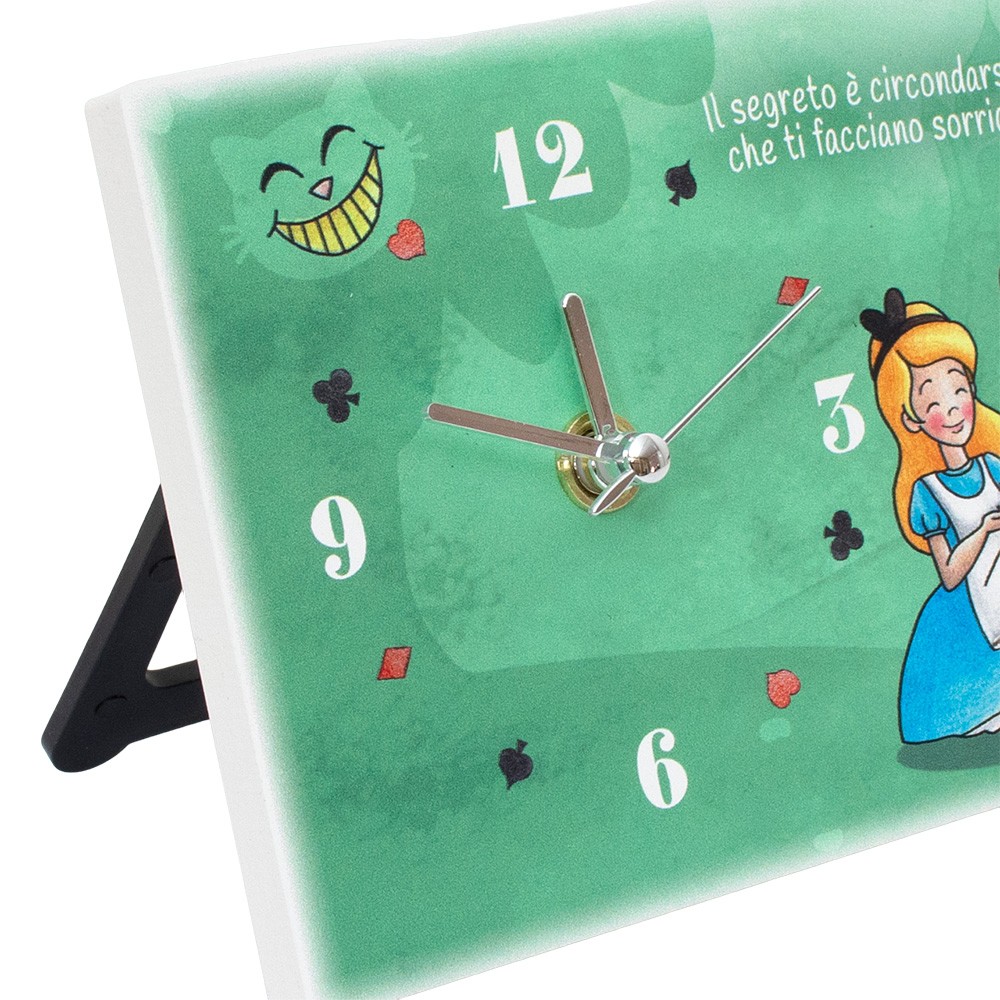 Orologio da tavolo decoro Alice nel paese delle meraviglie, realizzato in legno bianco su fondo verde, decorato con frase: " Il segreto è circondarsi di persone che ti facciano sorridere il cuore".