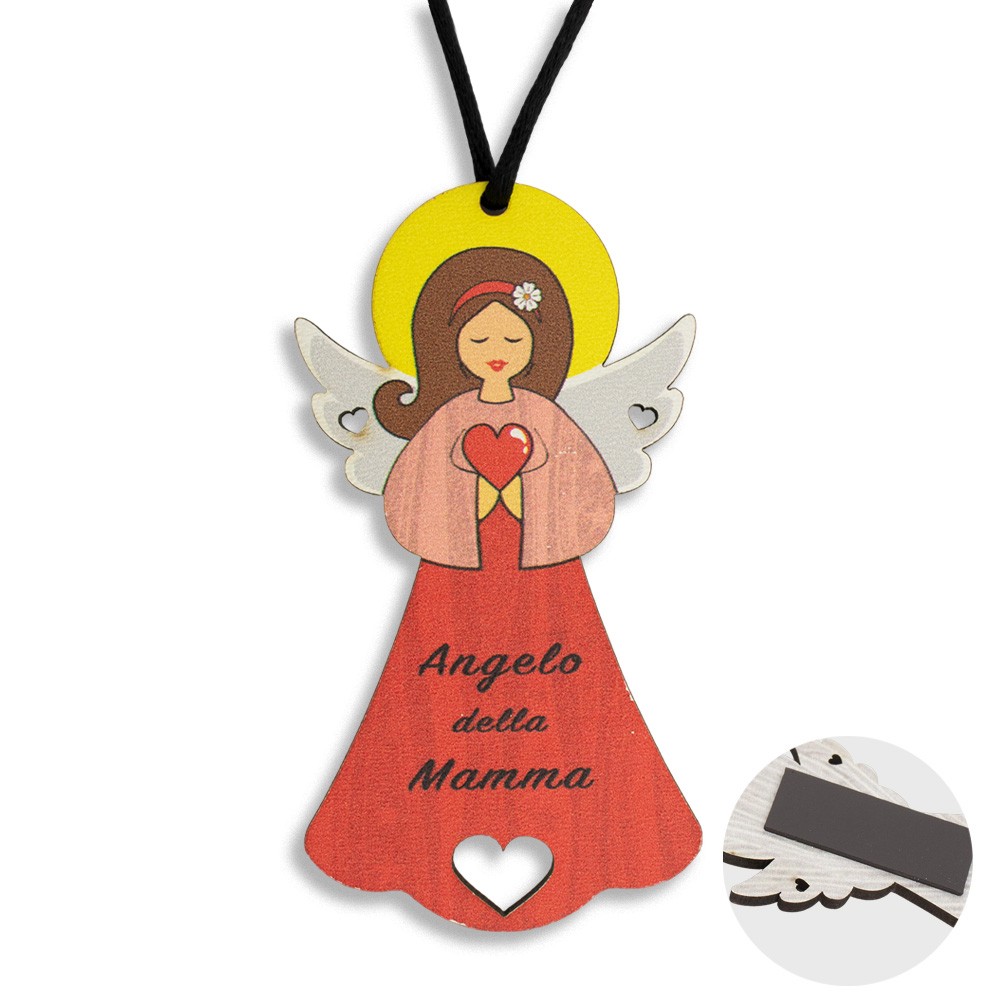 Angioletto magnetico in polimero con cuore tra le mani, e cordino dorato per appenderlo. Confezionato in cartoncino decorato.