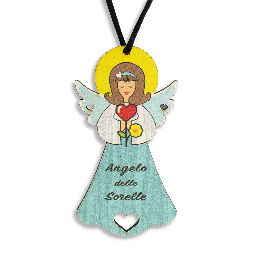 Il magnete è sagomato in MDF a forma di angioletto finemente decorato su fondo chiaro con stampa "Angelo delle sorelle".