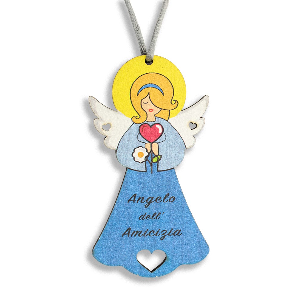 La calamita è sagomata in MDF a forma di angioletto finemente decorato su fondo chiaro con stampa "Angelo dell'amicizia".
