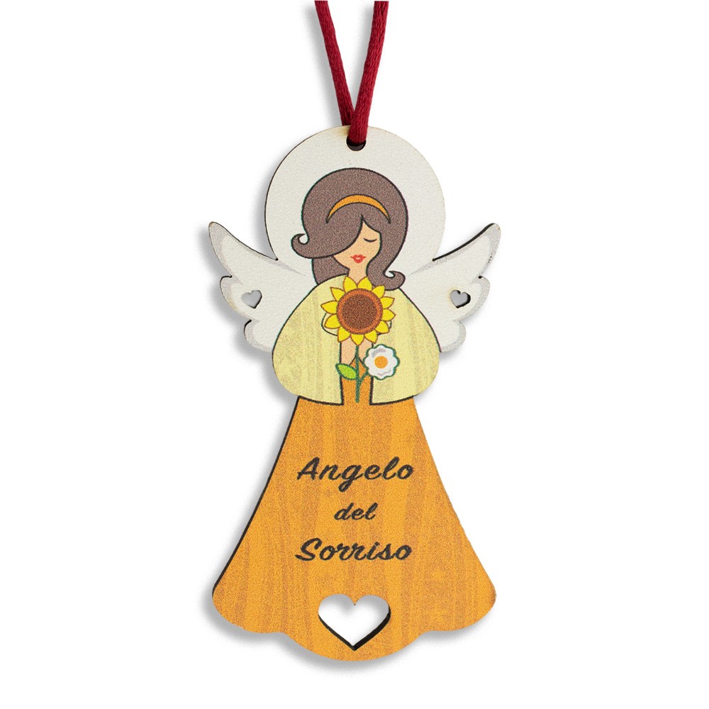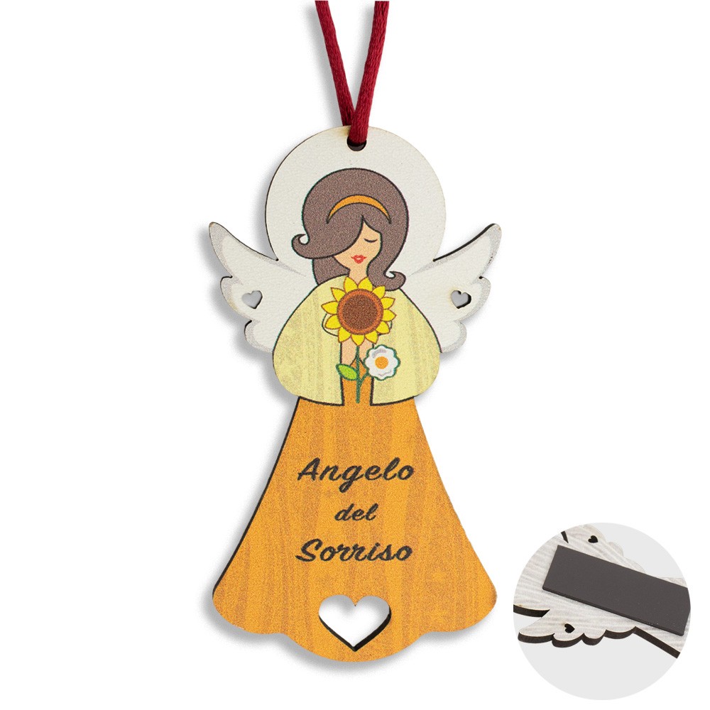 Il magnete è realizzato in MDF a forma di angioletto finemente decorato su fondo chiaro con stampa "Angelo della sorriso".