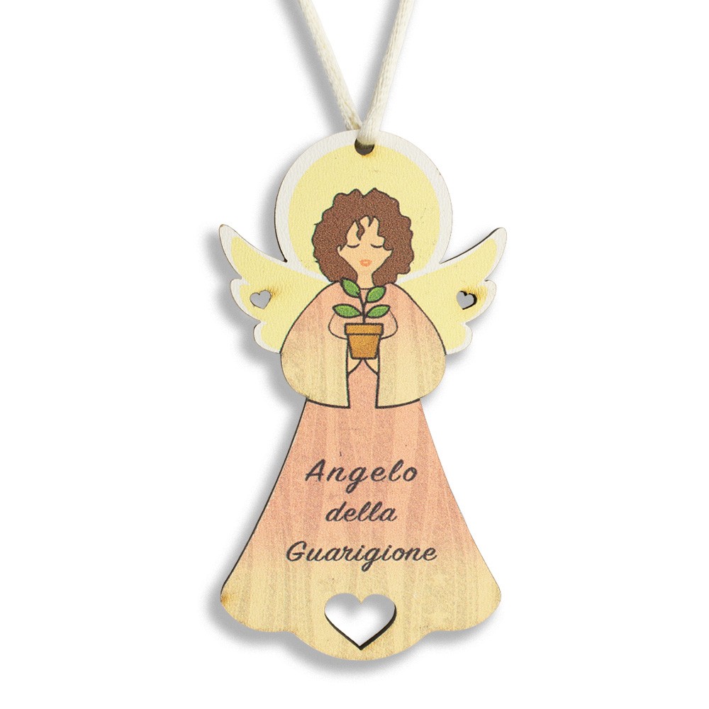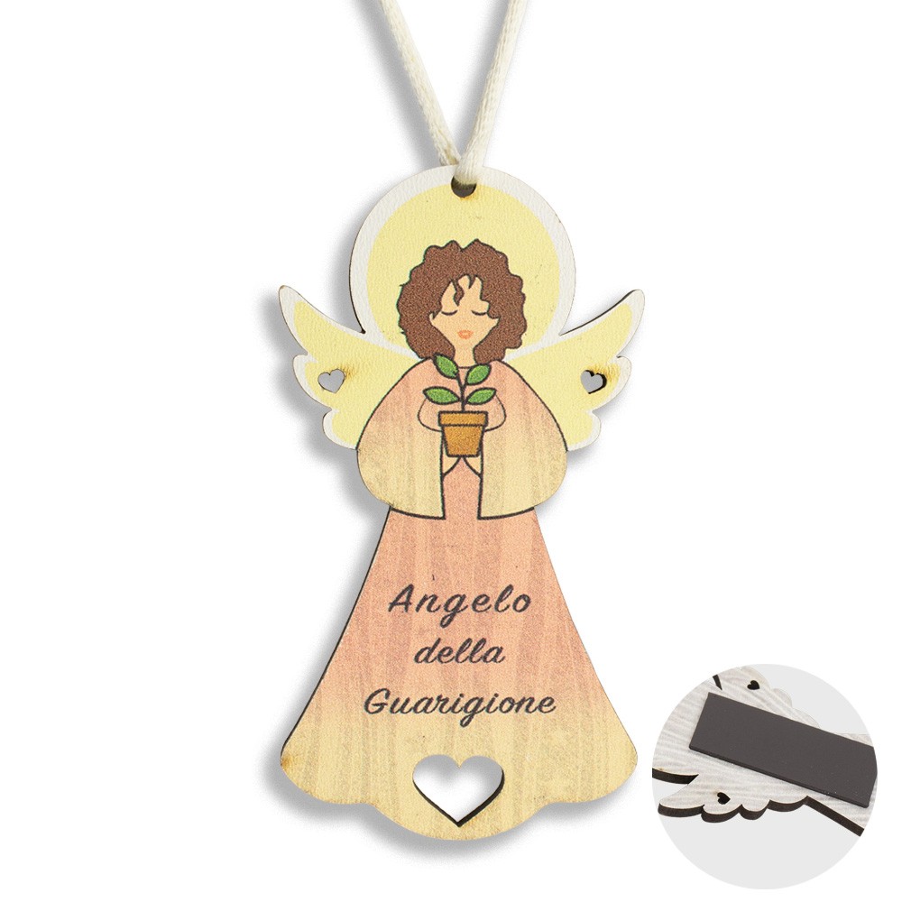 Il magnete è realizzato in MDF a forma di angioletto finemente decorato su fondo colorato con stampa "Angelo della guarigione ".