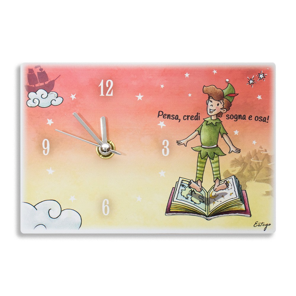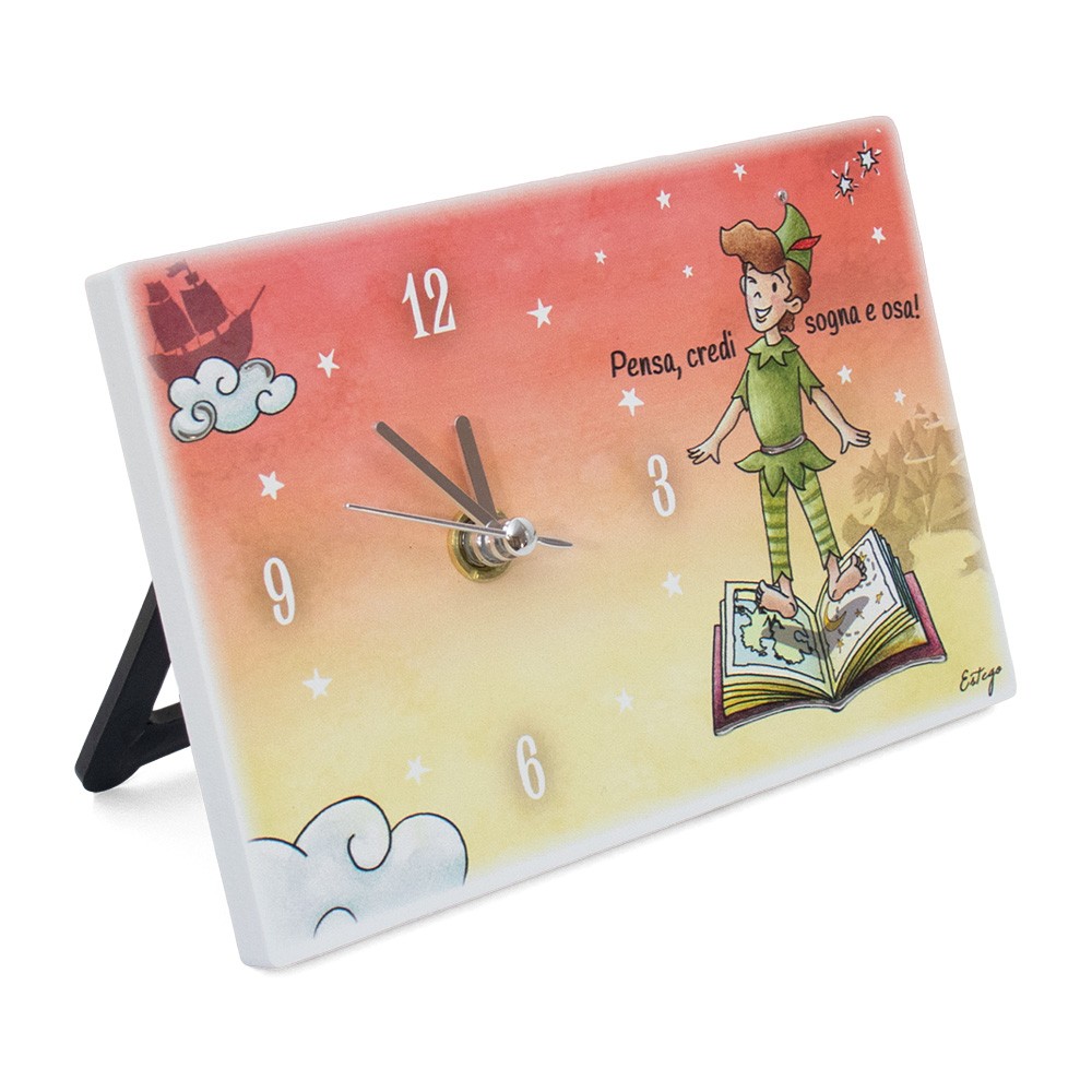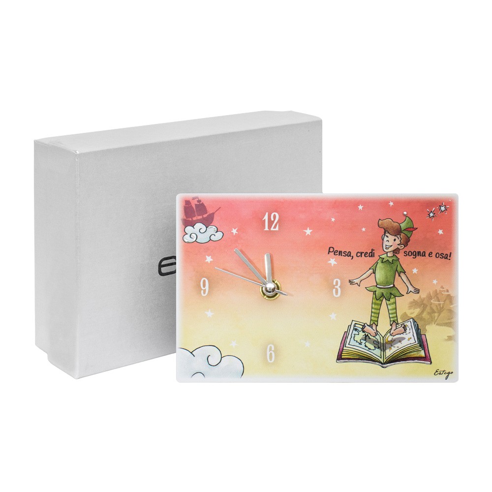 Orologio da tavolo in legno bianco e fondo colorato con decoro PETR PAN.