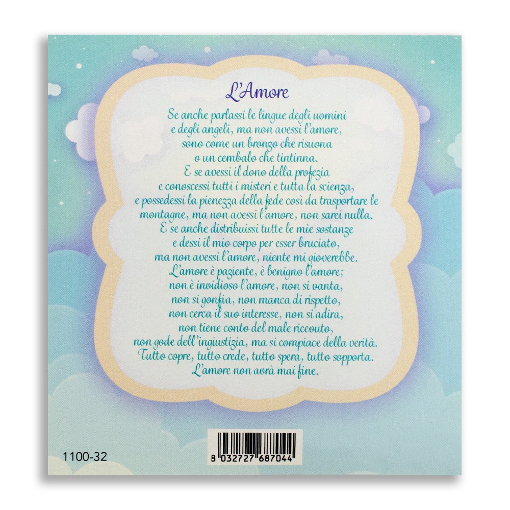 Viene fornito imbustato singolarmente con cartoncino decorato e preghiera stampata.