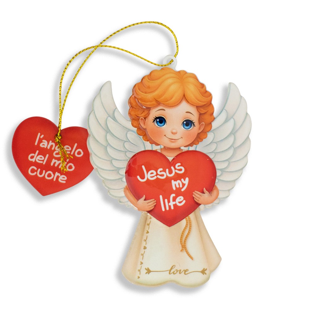 Angioletto magnetico in polimero con cuore tra le mani e dolce scritta “Jesus my life”.