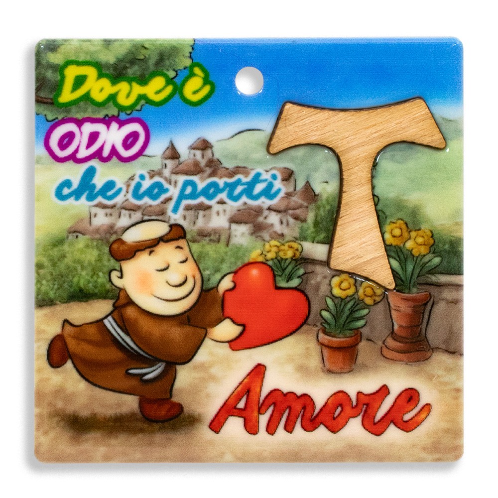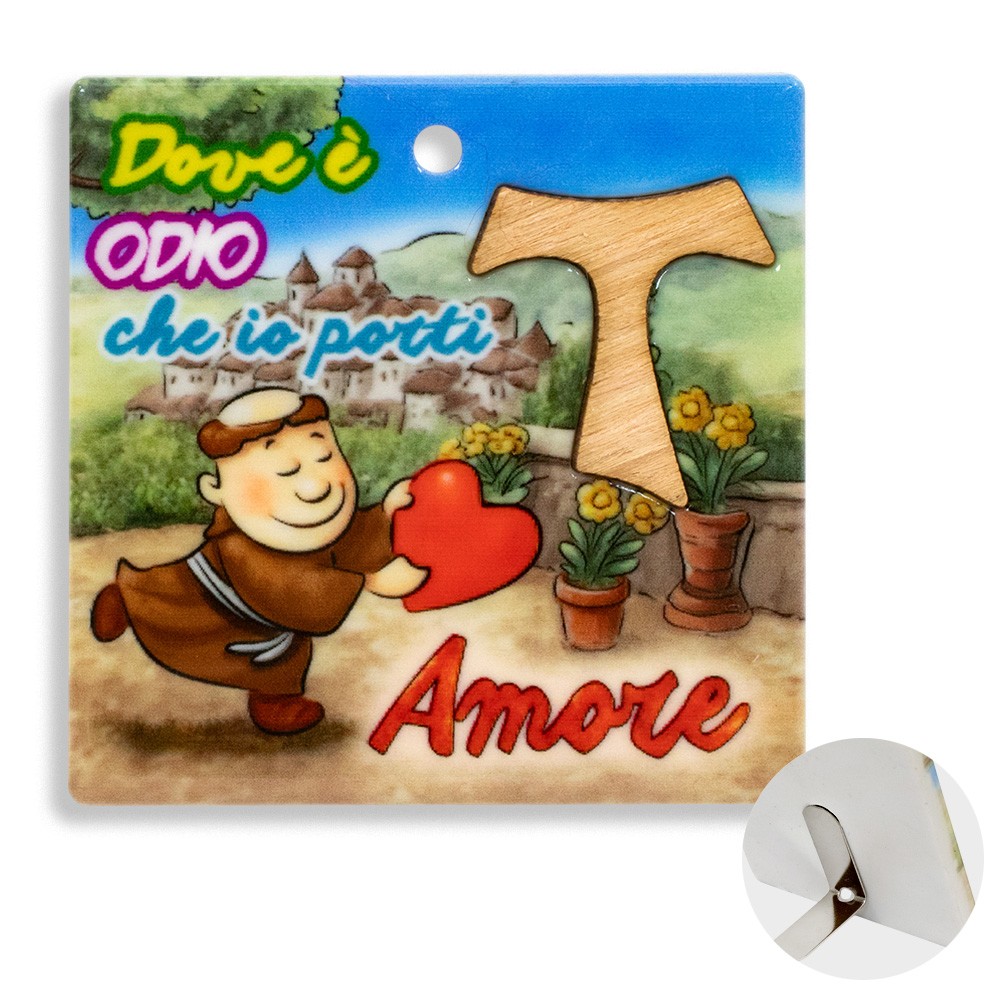 Questo magnete quadrato da 6x6 cm unisce funzionalità e significato spirituale. Presenta la frase “Dove è Odio che io Porti Amore” e può essere utilizzato come magnete da fissare su superfici metalliche o come piccolo quadretto da appoggio grazie al piedino in metallo.