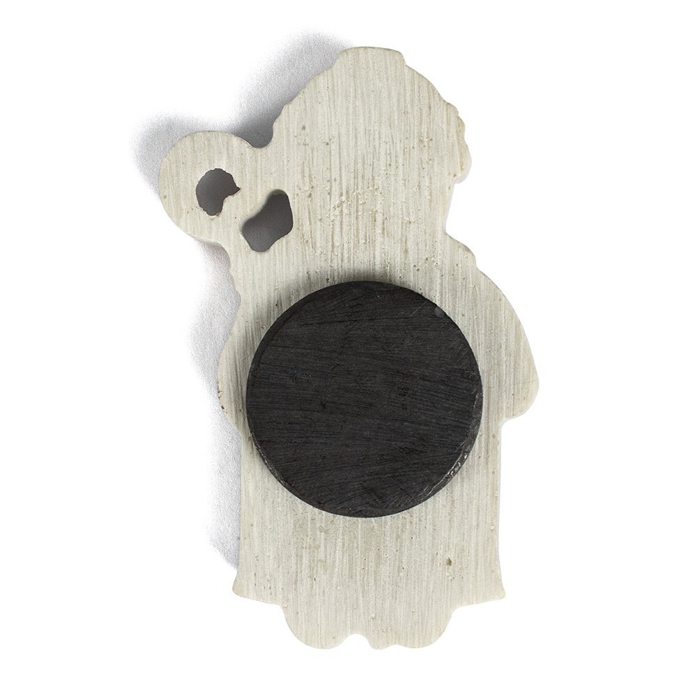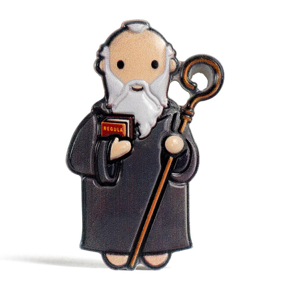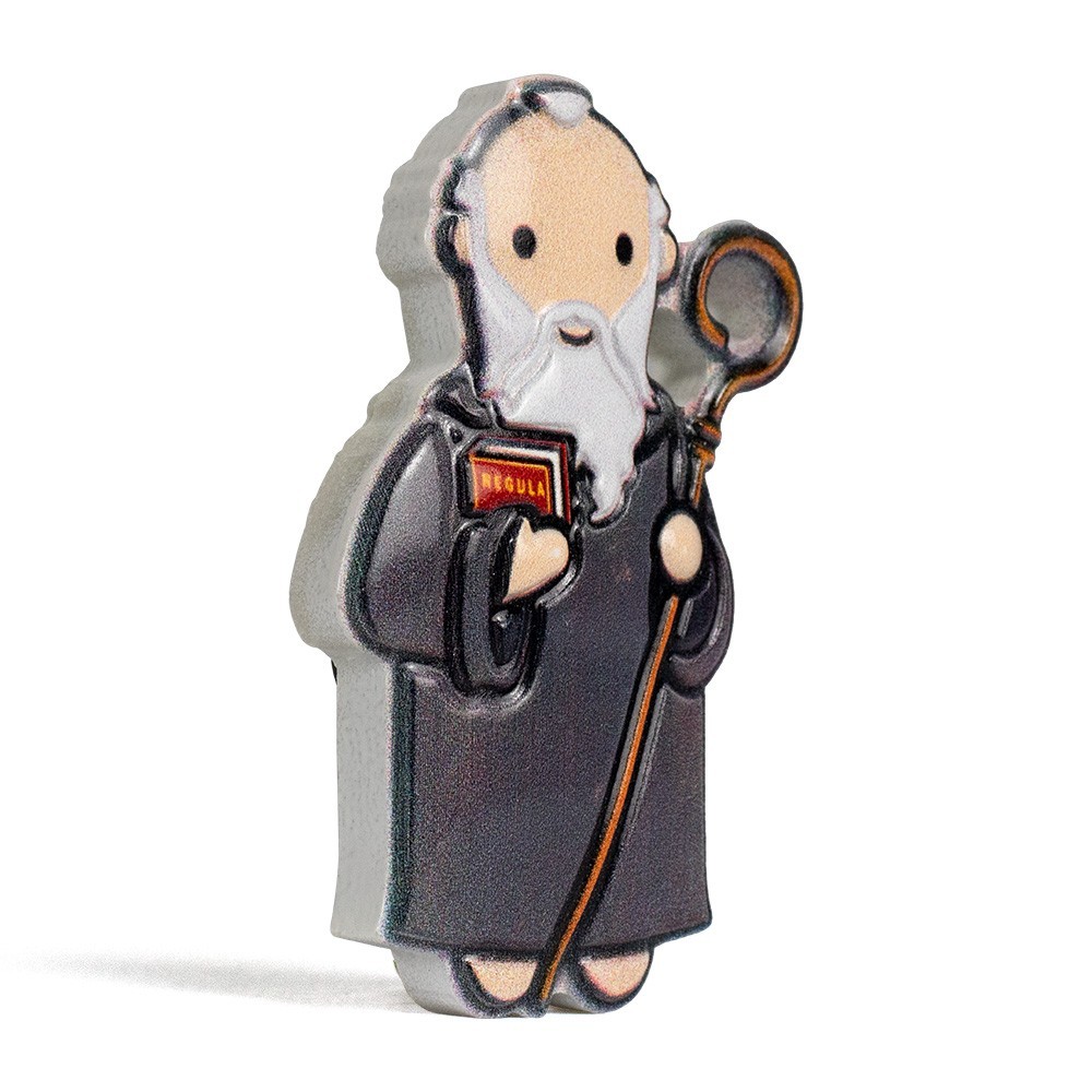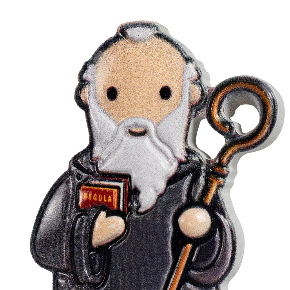Magnete in resina con sagoma di San Benedetto, confezionato in bustina trasparente con cartoncino (dimensioni 9x8,5 cm). Sul retro del cartoncino è riportata la Preghiera a San Benedetto.