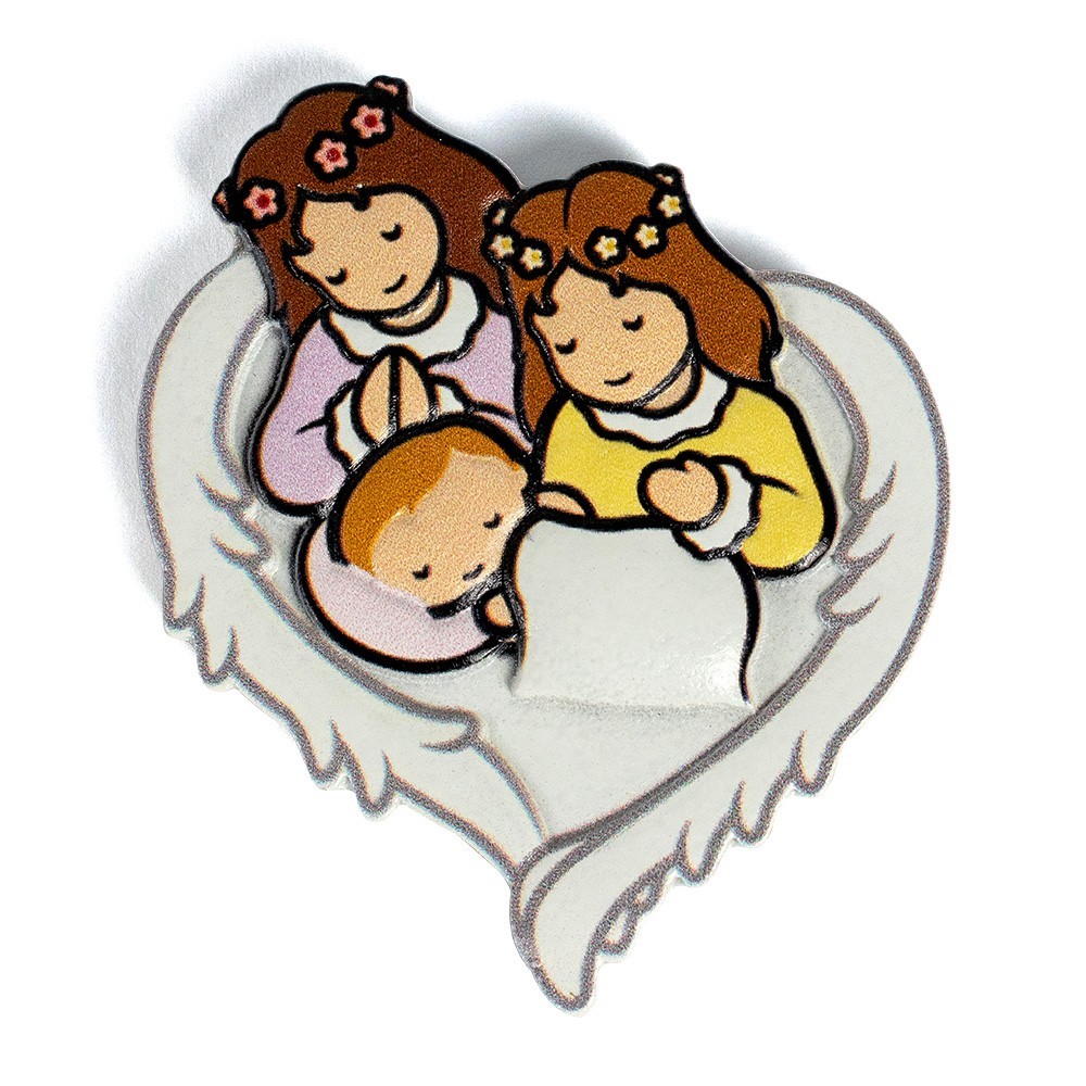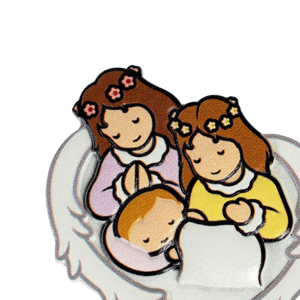 Magnete Angelo di Dio. Il magnete è a forma di cuore con tre bambini che pregano. Il tutto confezionato in bustina trasparente con cartoncino con preghiera Angelo di Dio.