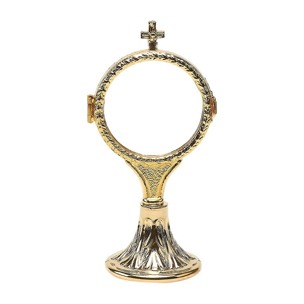 Teca eucaristica in fusione ottone dorato e oblò in vetro. con diametro di 9 cm. La teca è alta 18 cm. Articolo eseguito rigorosamente in Italia.
