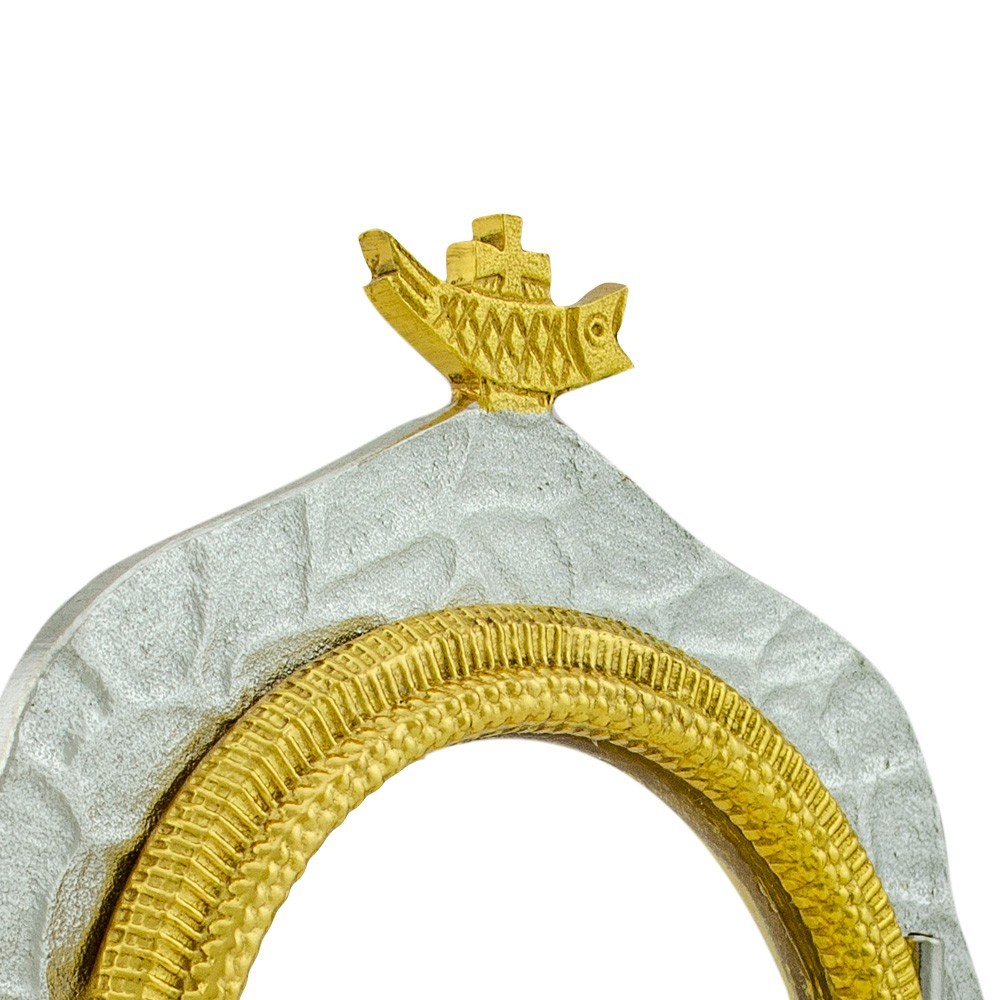 Questa teca eucaristica è realizzata in ottone bicolore con finitura oro e argento, completa di vetro per l'esposizione.