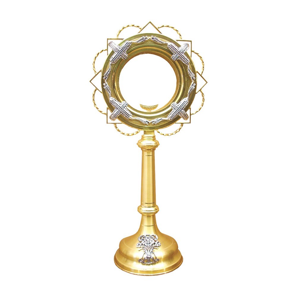 Ostensorio liturgico cn lunetta in ottone dorato con riporti argentati. Sulla raggiera sono applicate croci con angeli, mentre sulla base vi è una ricca fusione di fiori. Articolo di alta qualità, eseguito da artigiani professionisti. Produzione italiana.