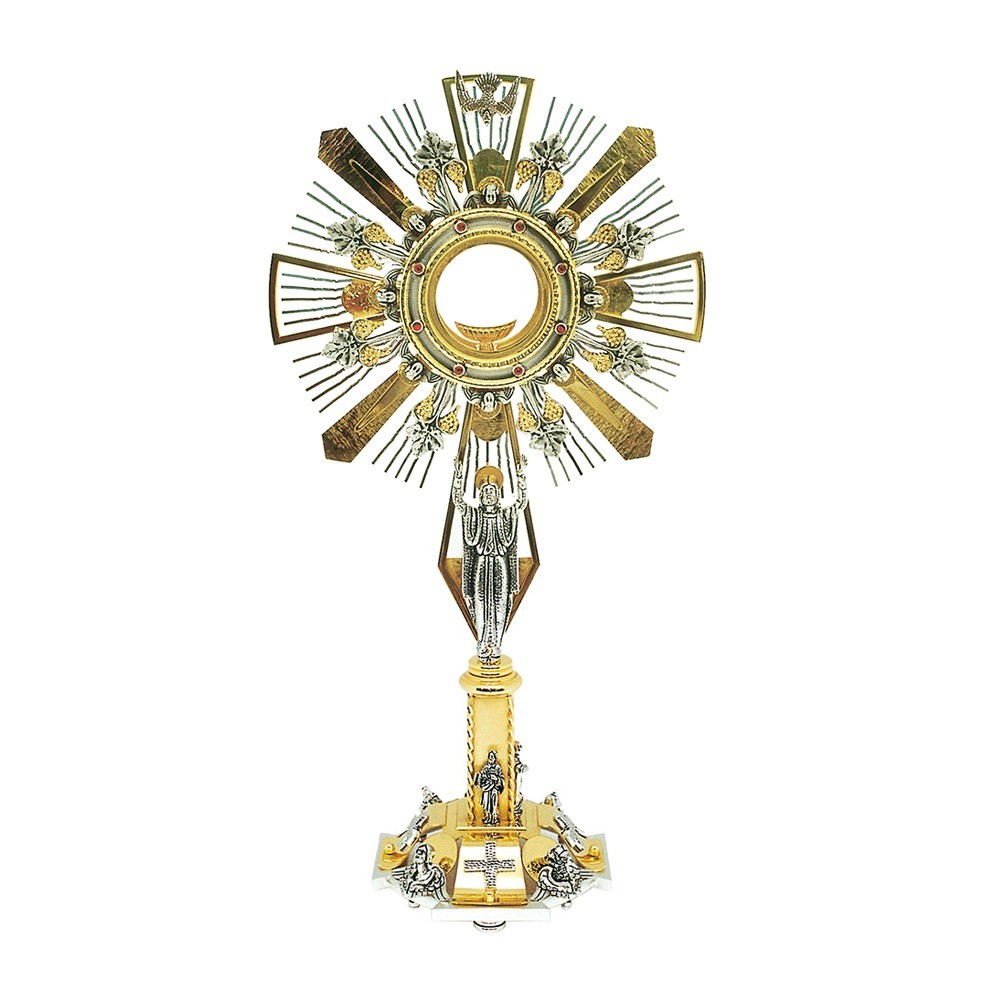 Ostensorio (alto 60 cm) in ottone bicolore con finitura argento e dorato. Questo arredo sacro è finemente decorato. Sul piede sono riportati fusioni con i quattro Evangelisti e simboli della Croce.