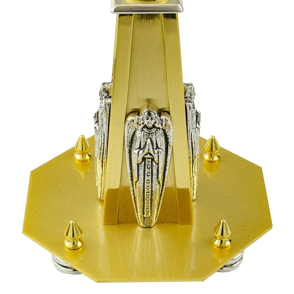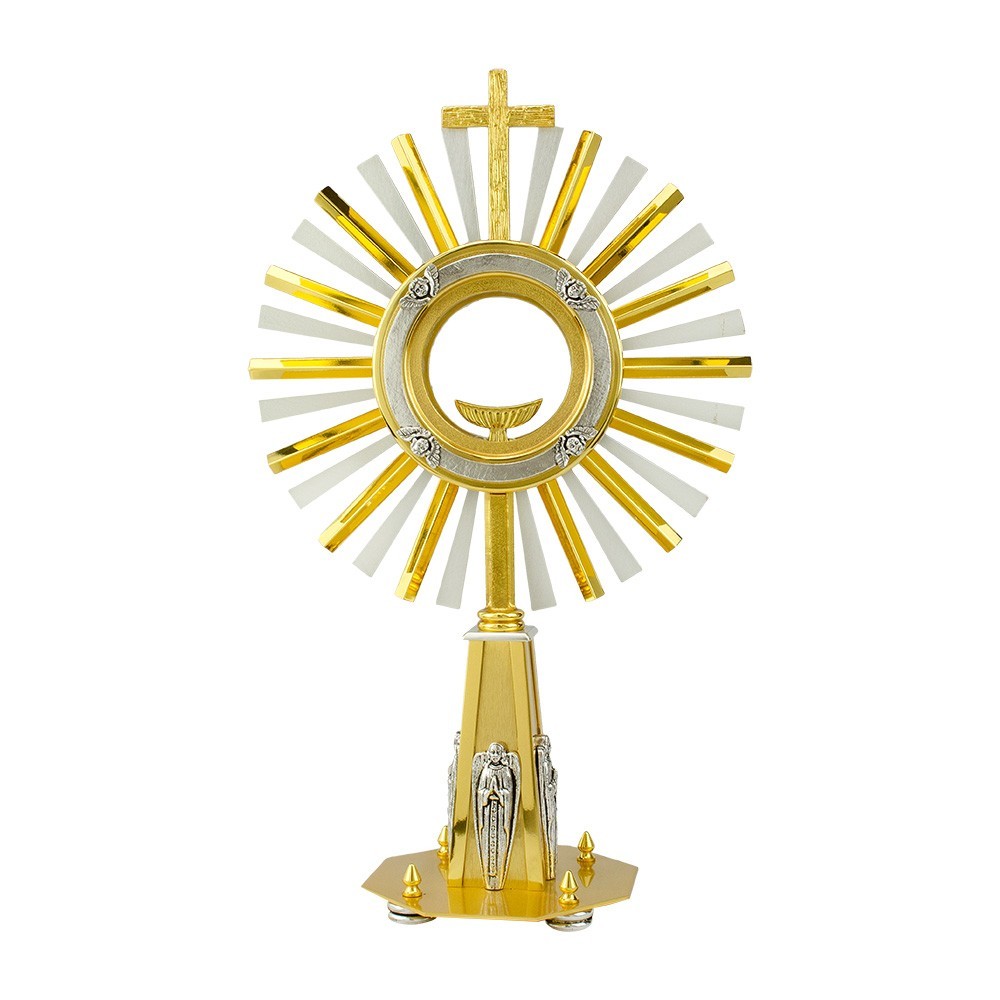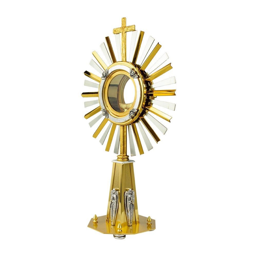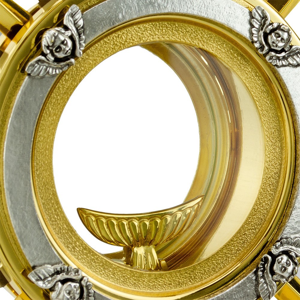Ostensorio per adorazione Santissimo in ottone bicolore. Sulla colonna sono raffigurati quattro angeli oranti, mentre quattro cherubini decorano la teca centrale.