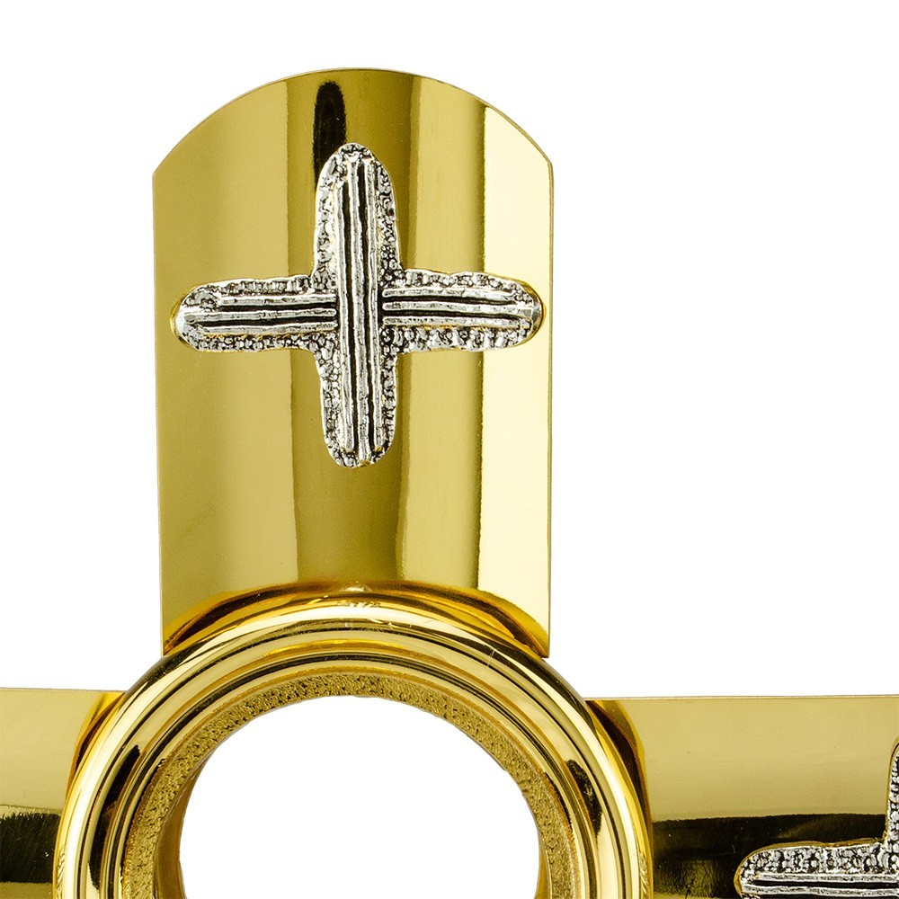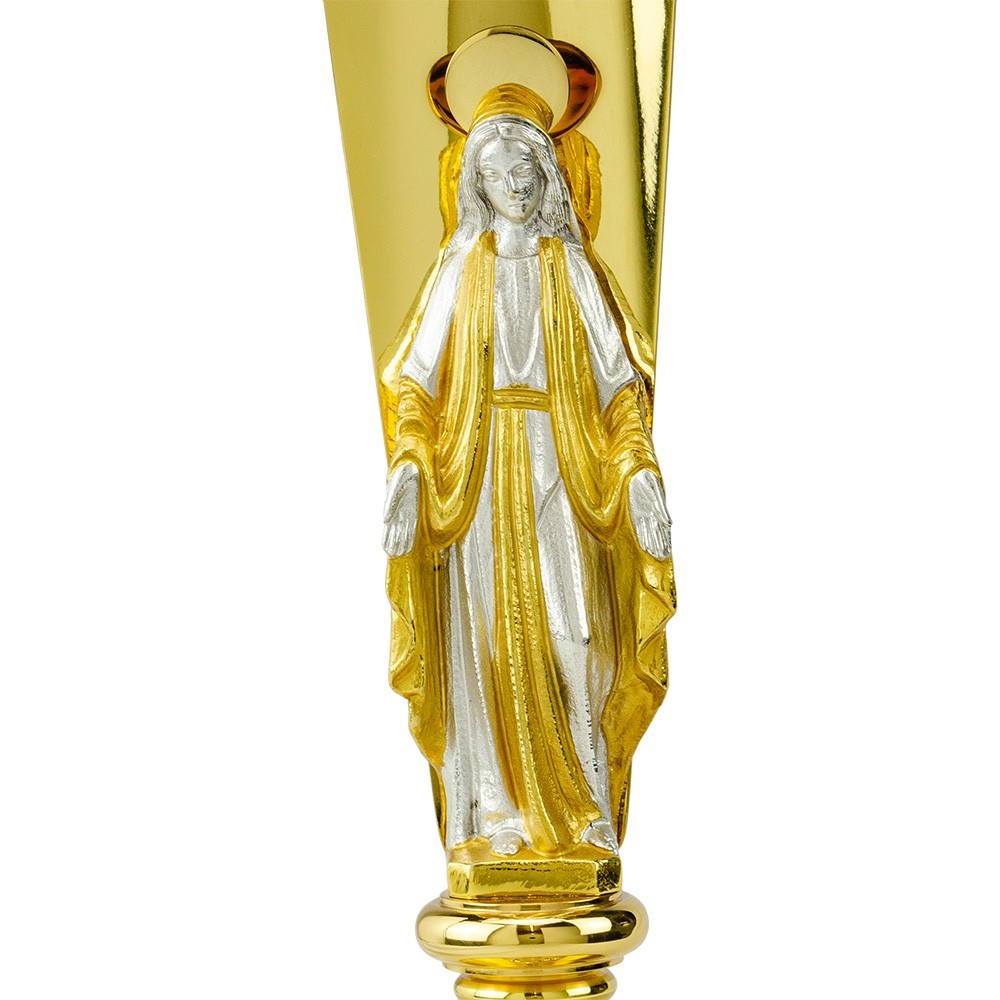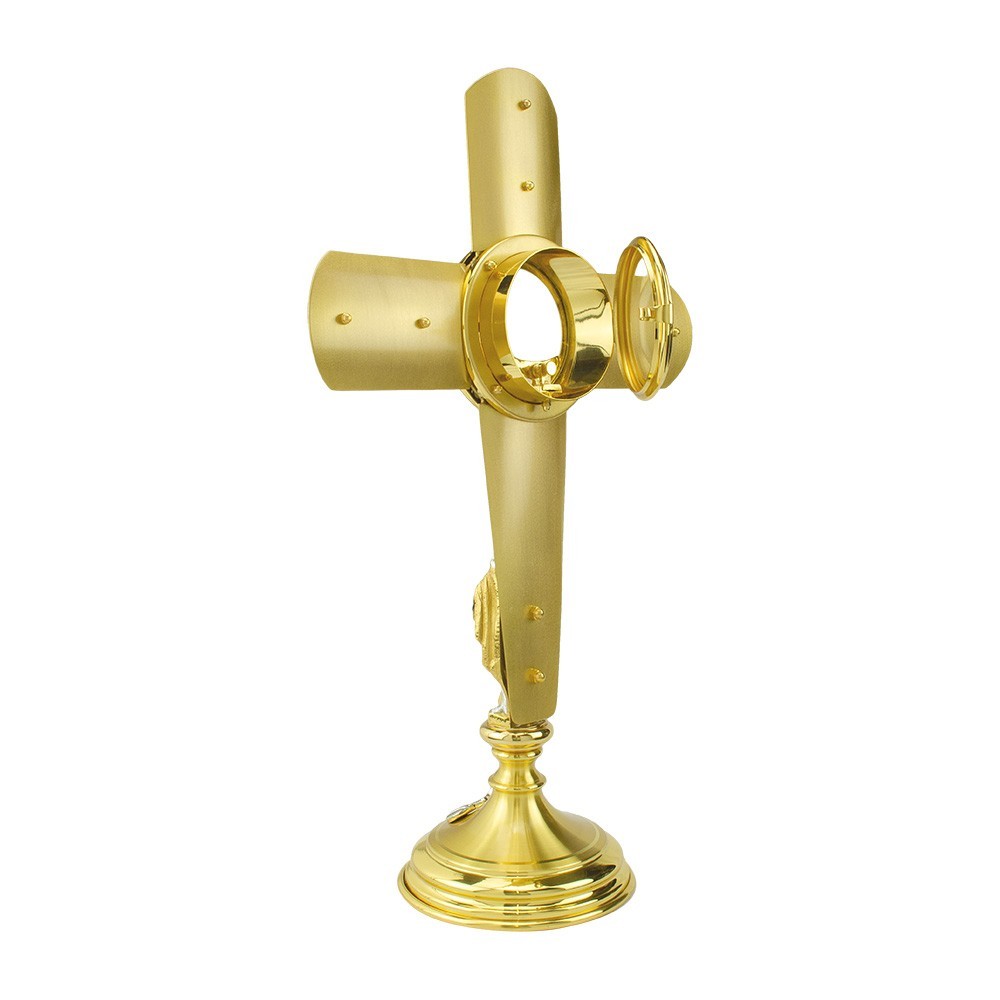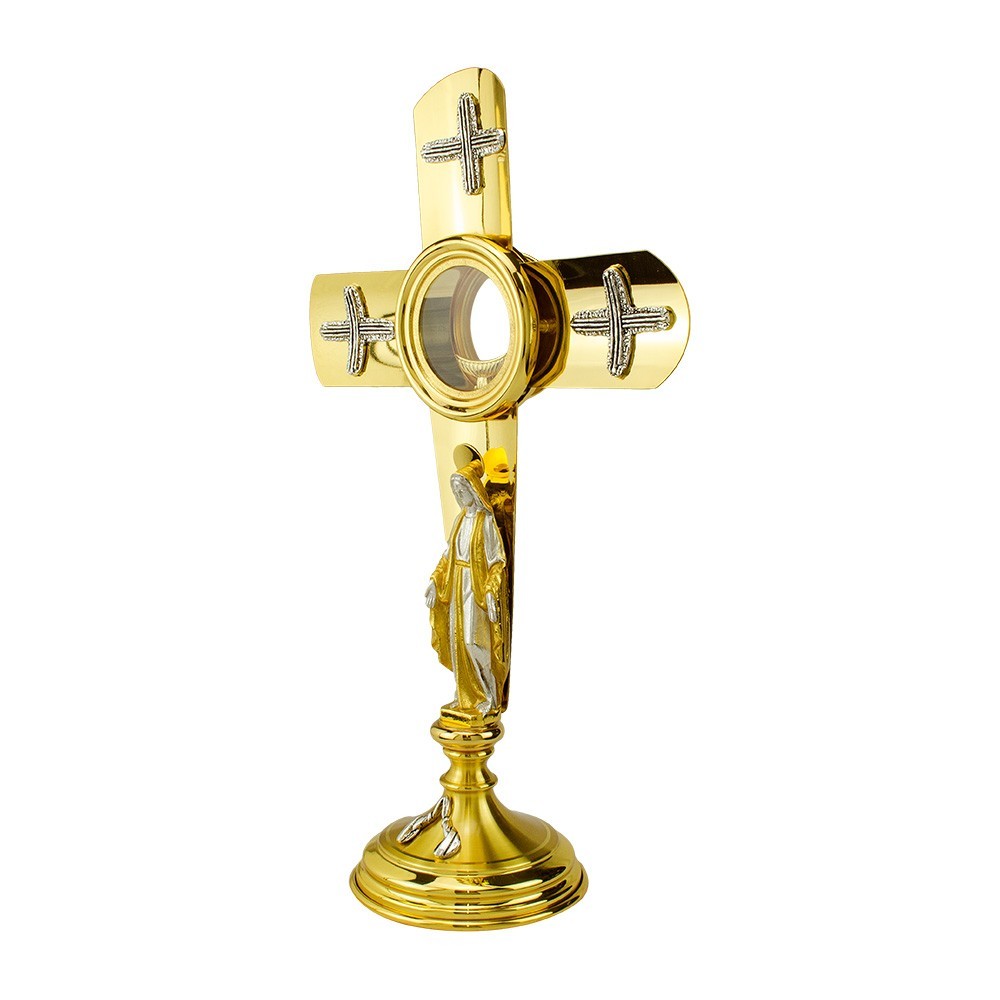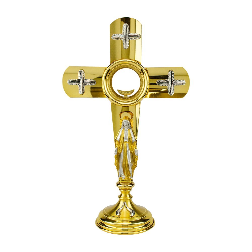 Ostensorio eucaristico, arredo sacro realizzato interamente in ottone bicolore e decorato artigianalmente. Sulla colonna è posta la riproduzione della Vergine Maria. La croce dorata è impreziosita da tre croci argentate finemente decorate.