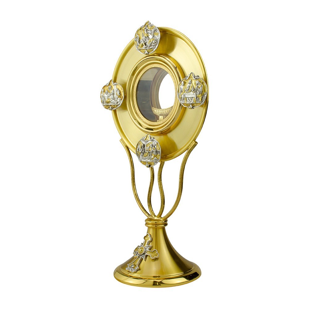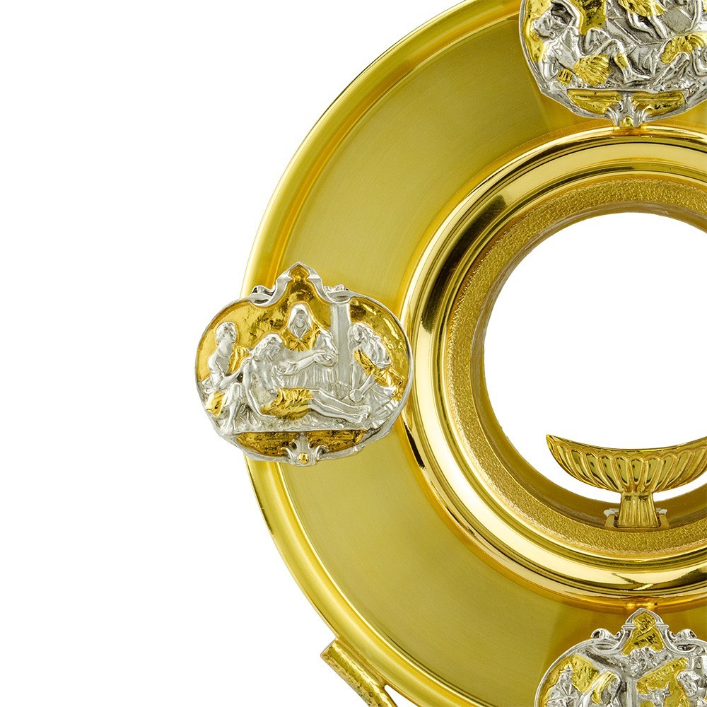 Ostensorio eucaristico, alto 28 cm, in ottone dorato con simboli bicolori. Una croce è posta sulla base e pacchette raffguranti scene sacre sono disposte sulla raggiera. con finitura argento e dorato.