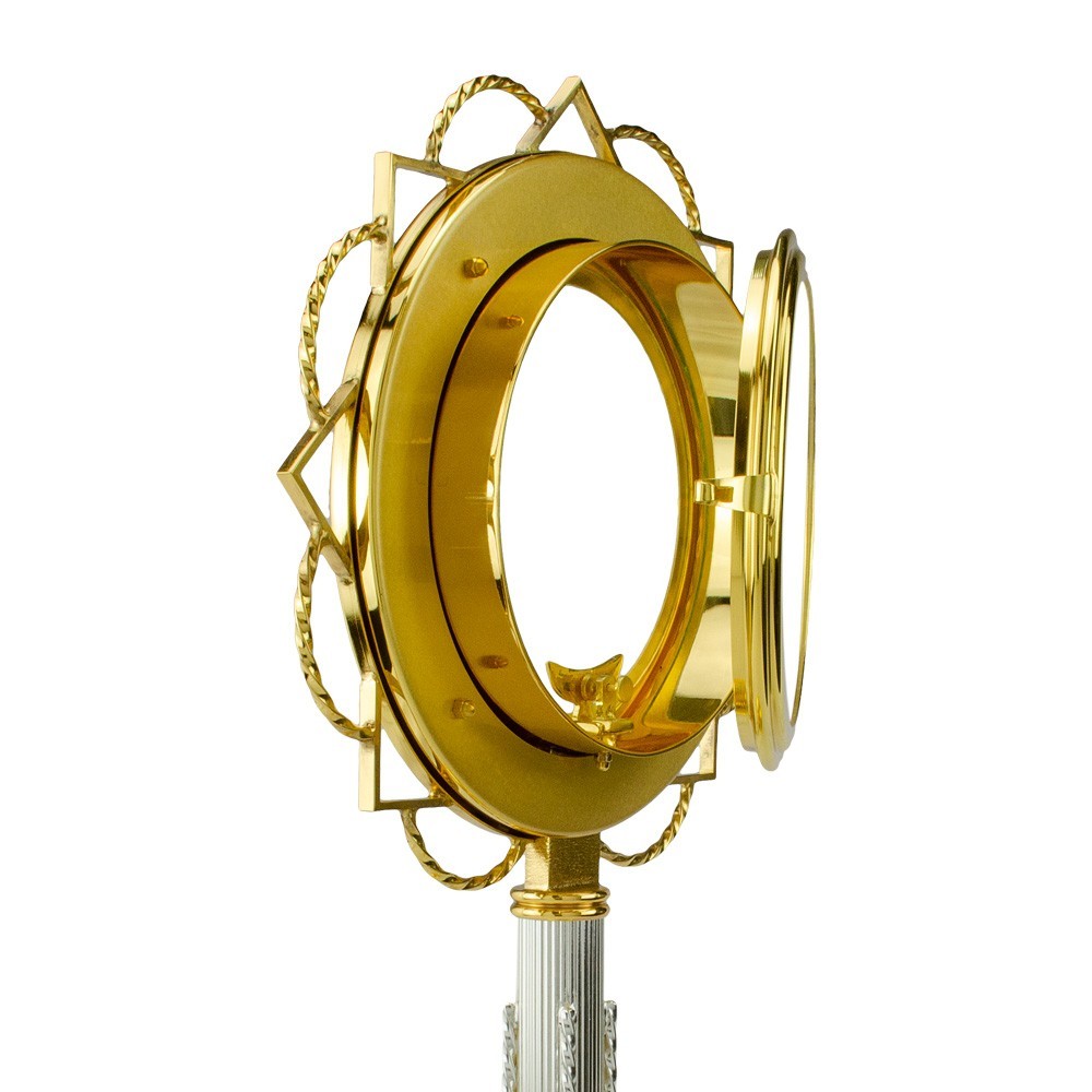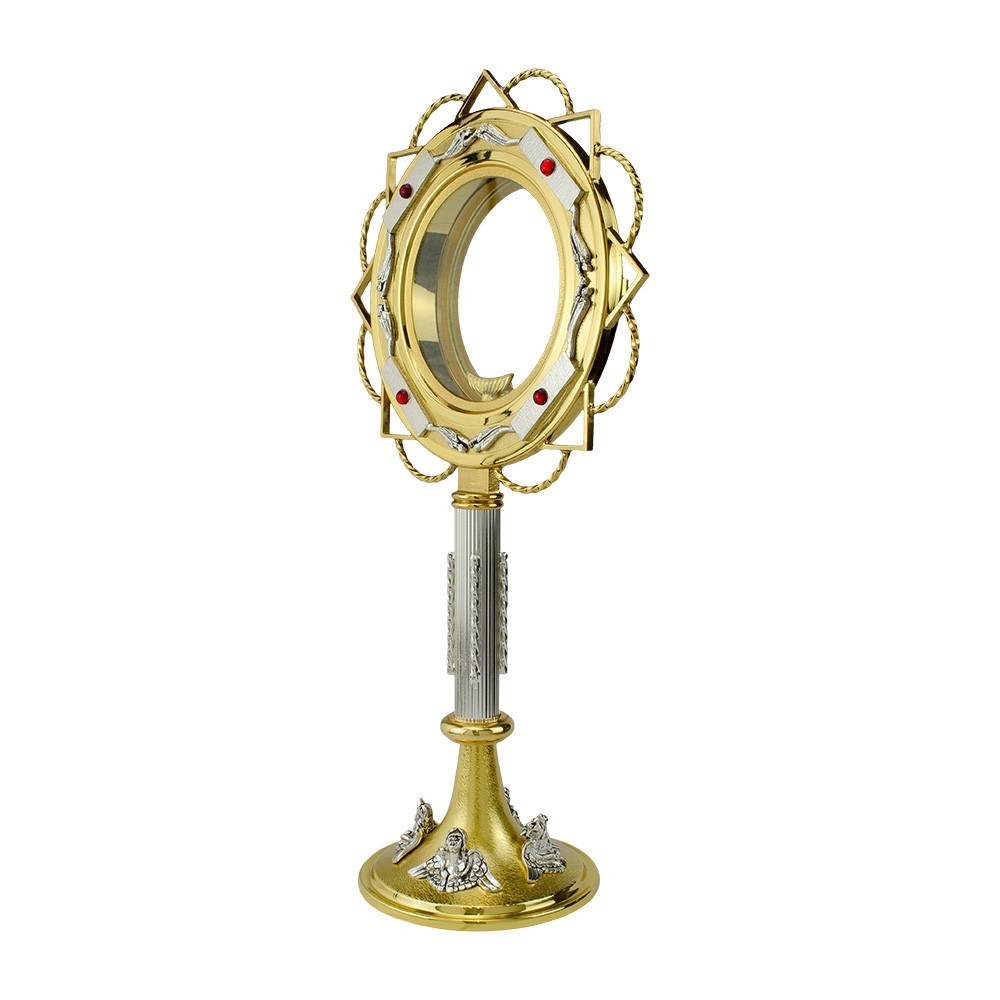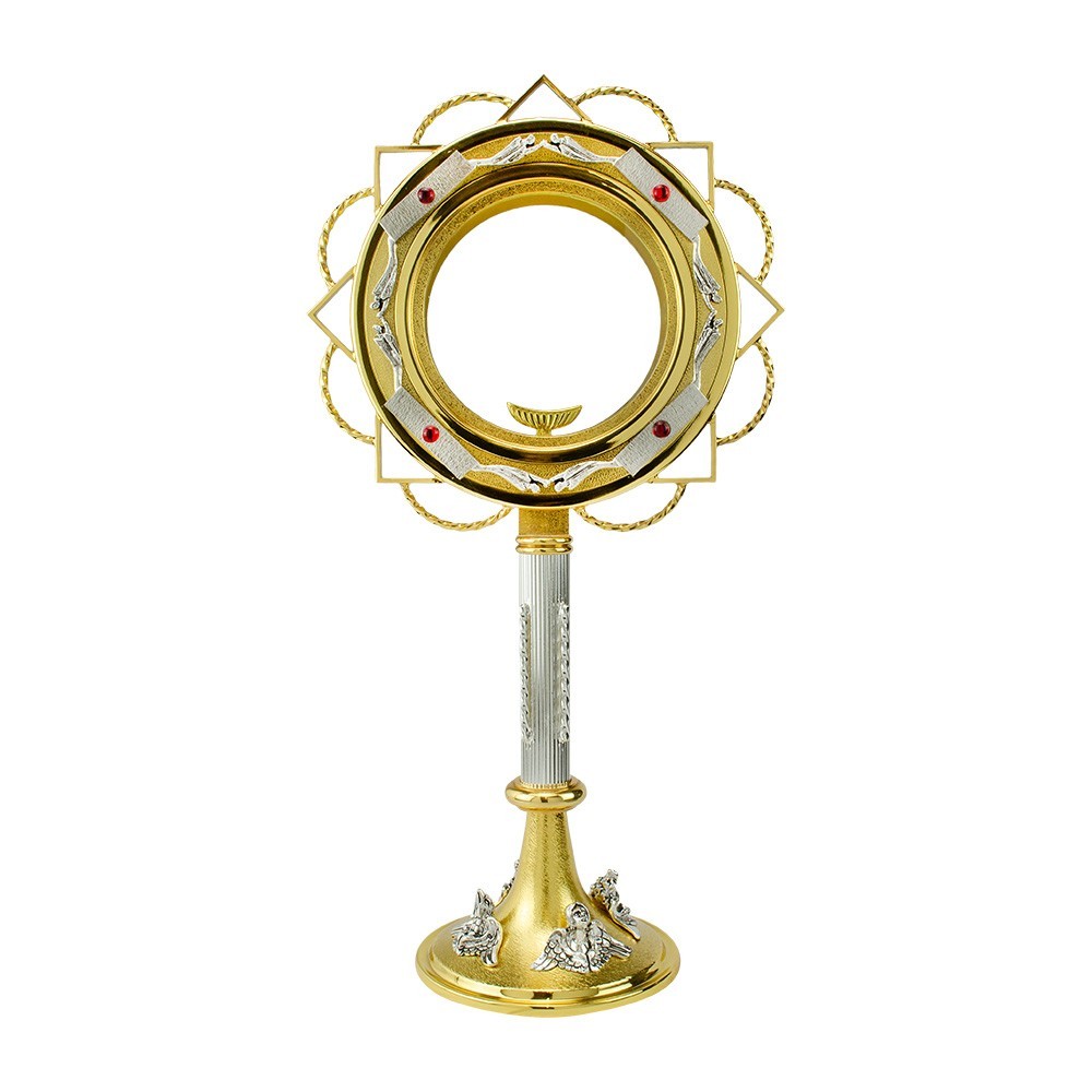 Ostensorio liturgico in ottone dorato con simboli argentati. La raggiera è decorata con angeli ed è impreziosita da pietre rosse. Sulla bse sono raffigurati i quattro Evangelisti.