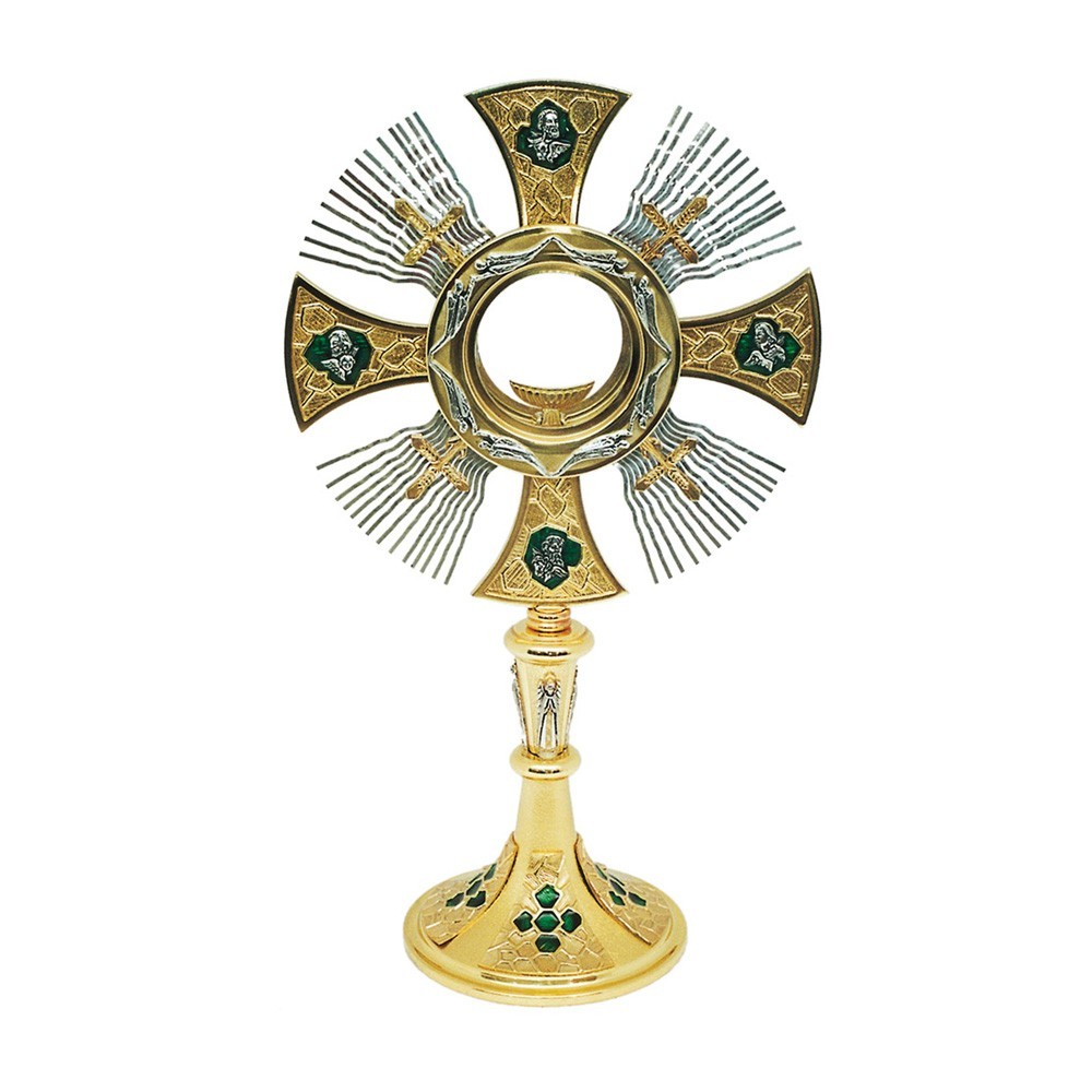 Ostensorio per adorazione in ottone dorato con ripoti smaltati di colore verde. Sulla colonna centrale e intorno alla teca sono raffigurati angeli , mentre sulla raggiera vi sono i simboli dei quattro Evangelisti.