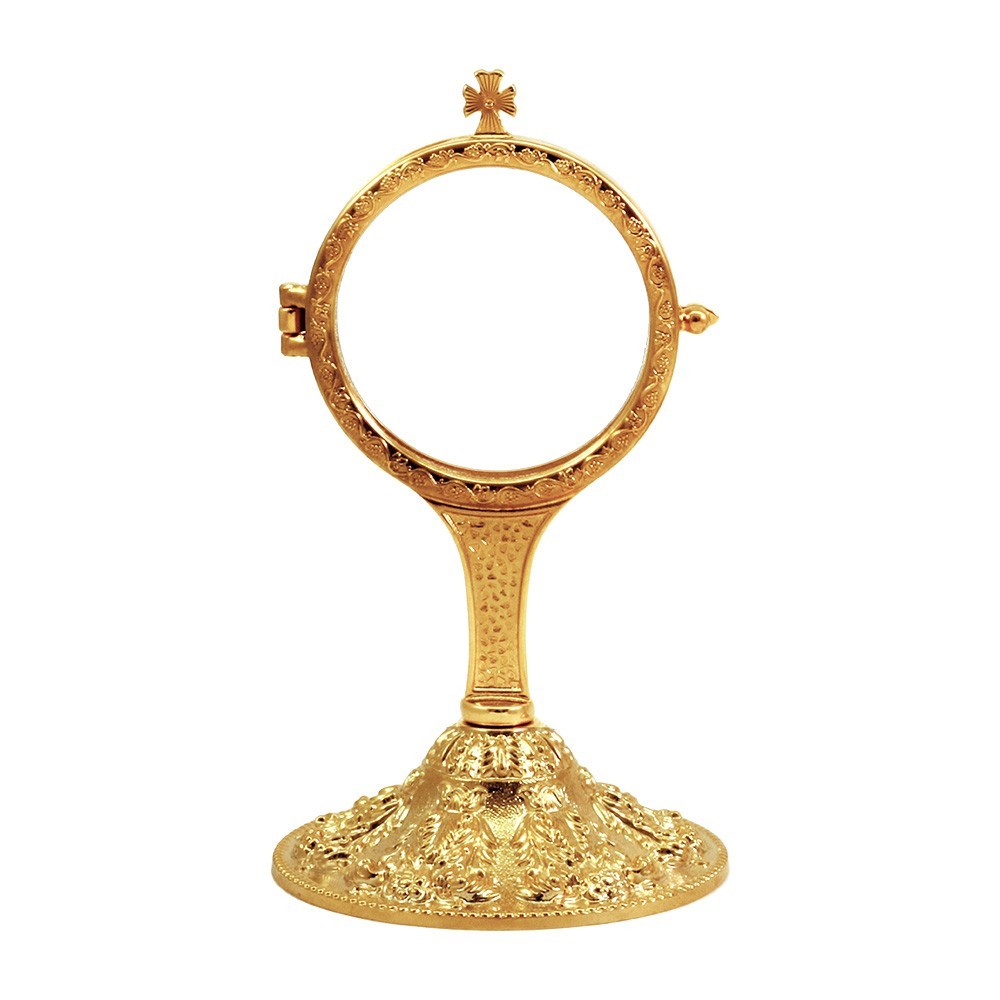 Ostensorio per adorazione Eucaristica su base barocca. La teca è interamente in ottone dorato ed è alta 19 cm, mentre l'oblò è in plexilass e misura 8 cm di diametro.