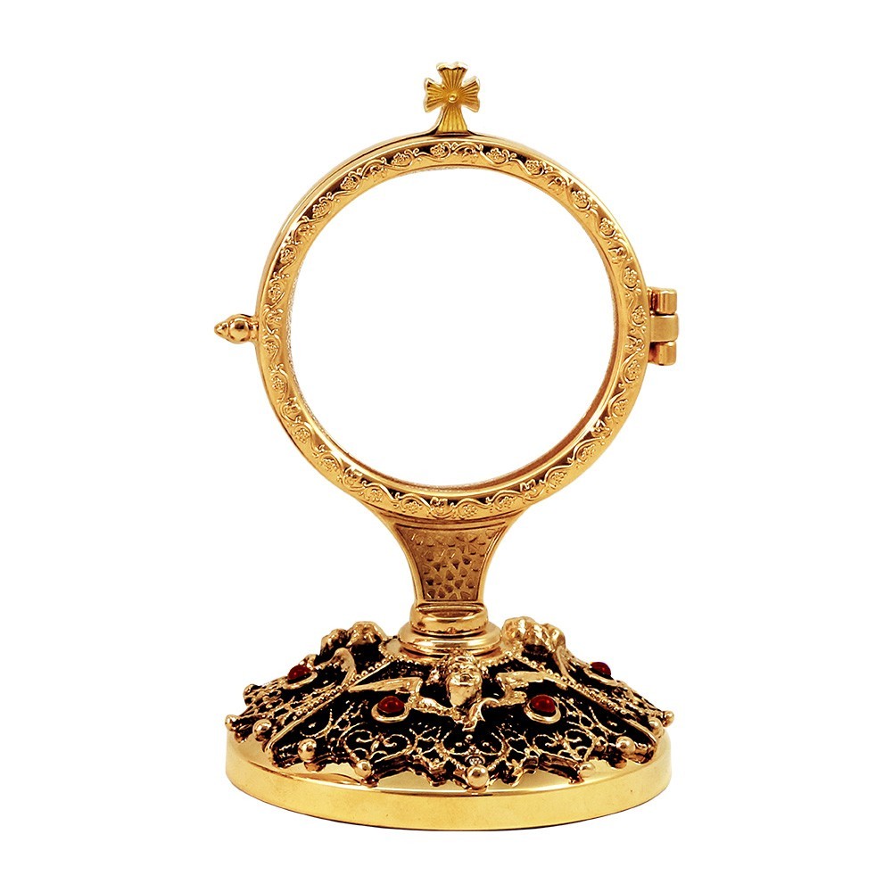 La particolarità di questo ostensorio è la base lavorata mediante la tecnica in fusione con decorazioni "Angeli", impreziosita da pietre rosse con finitura in bronzo antico. L'oblò è in plexiglass adatto per essere adoperato con facilità consentendo una migliore pulizia.