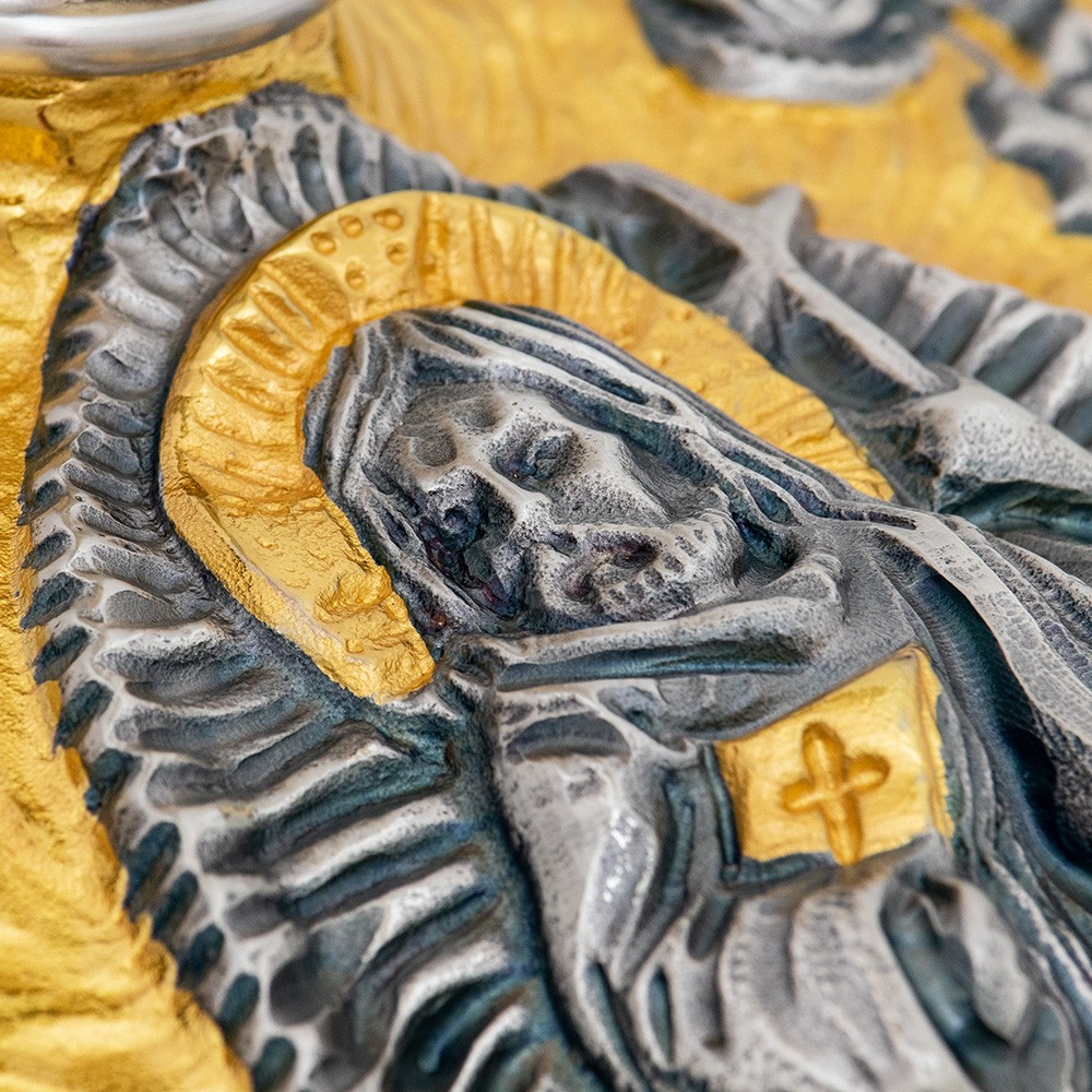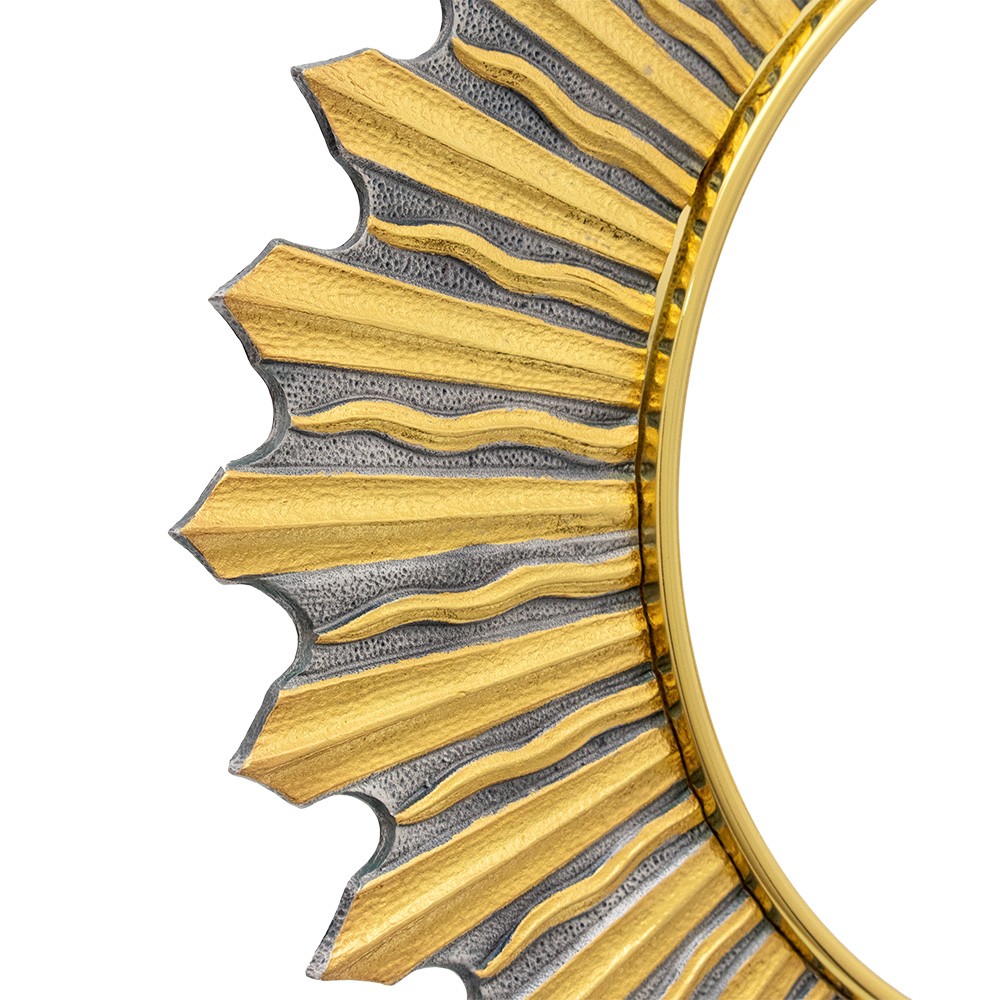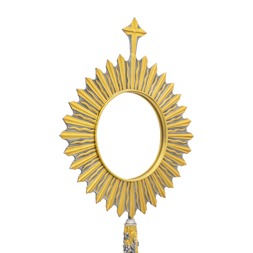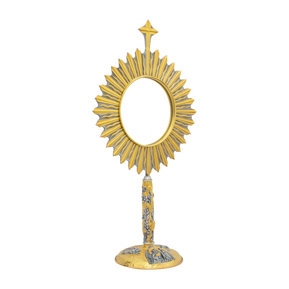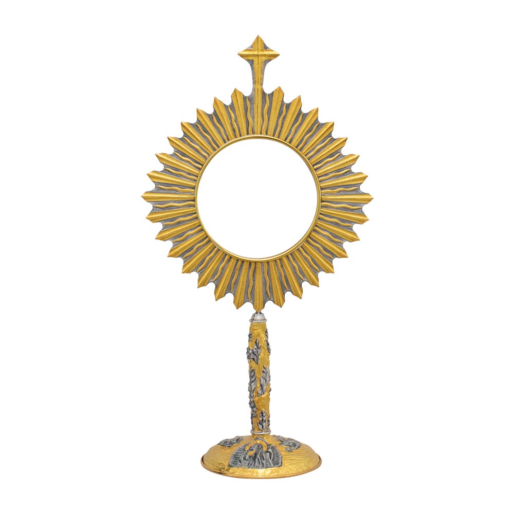 Ostensorio teca da esposizione del Santissimo Sacramento, realizzato interamente in ottone con finitura bicolore oro e argento. L'ostensorio è alto 68,5 cm, con un diametro totale 36 cm.