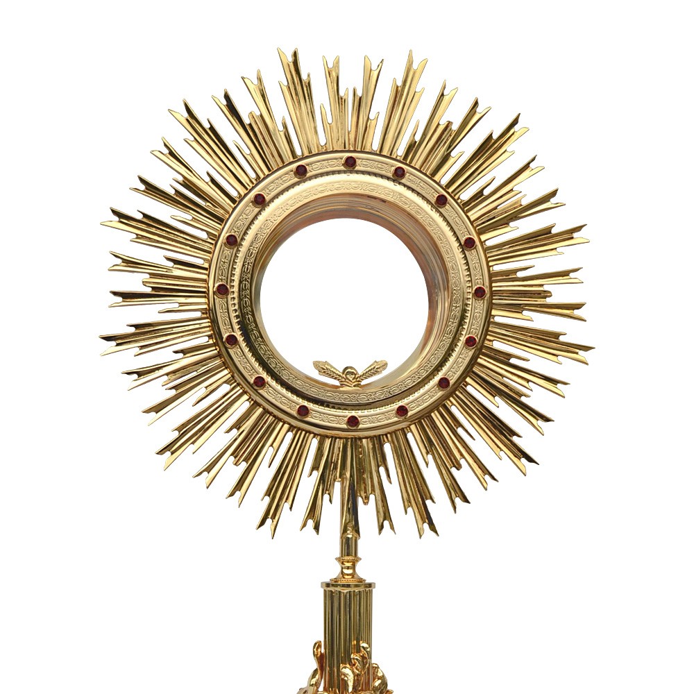 L'ostensorio è alto 80 cm ed è realizzato in ottone con foglie in fusione a cera persa e arricchito con pietre swaroski rosse.