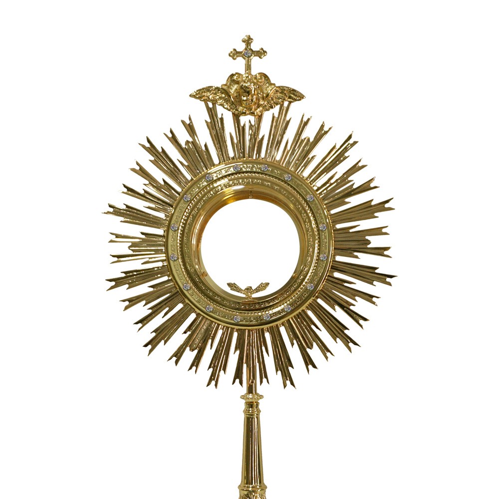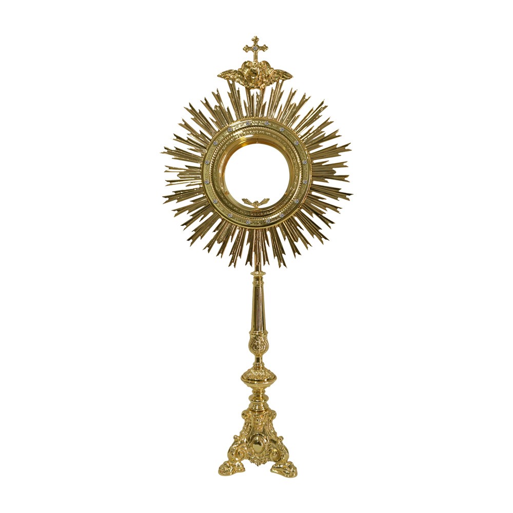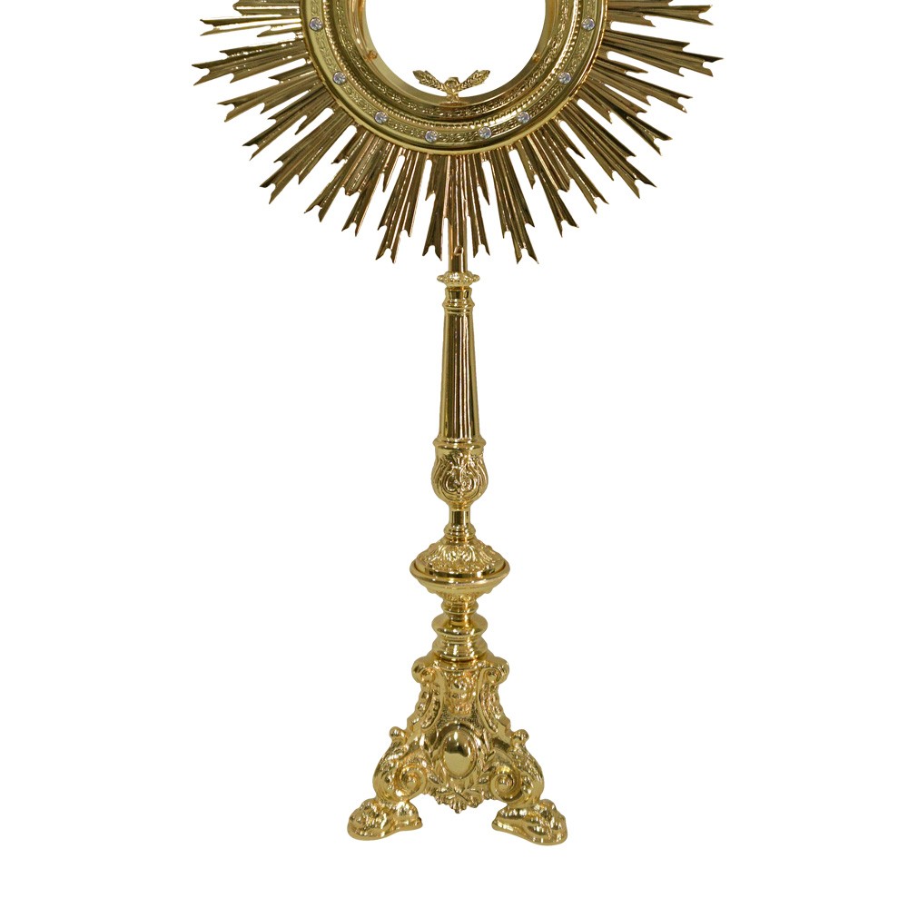 L'ostensorio è alto 84 cm, mentre il diametro della teca è 16 cm. L'ostensorio è realizzato in stile barocco ricco in ottone fusione a cera persa placcato oro 24k.