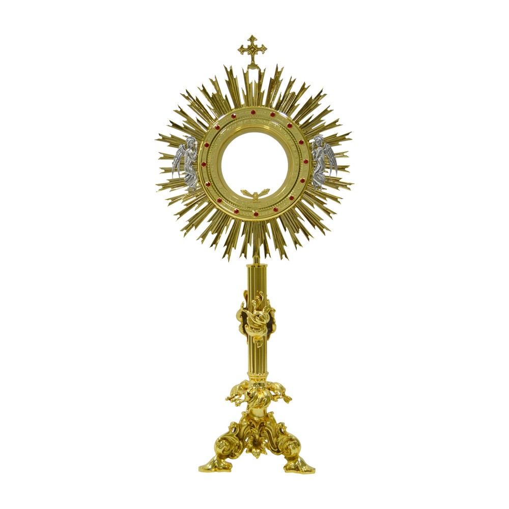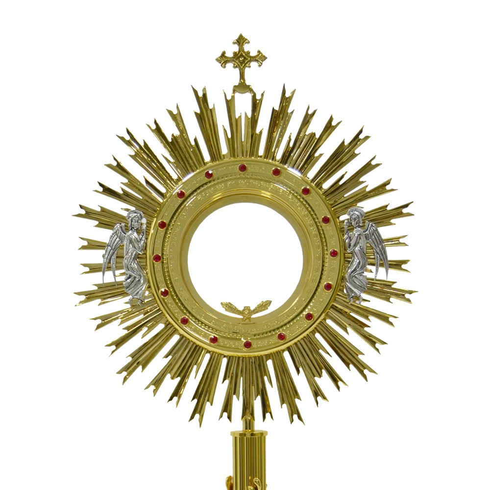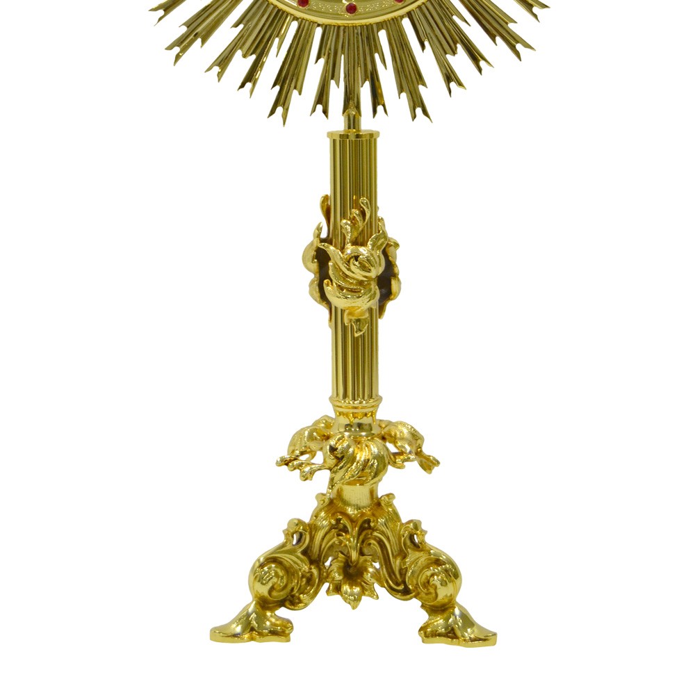 L'ostensorio è alto 80 cm, mentre il diametro della teca è 16 cm. Realizzato in stile barocco in ottone fusione a cera persa placcato oro 24k e pietre rosse incastonate.