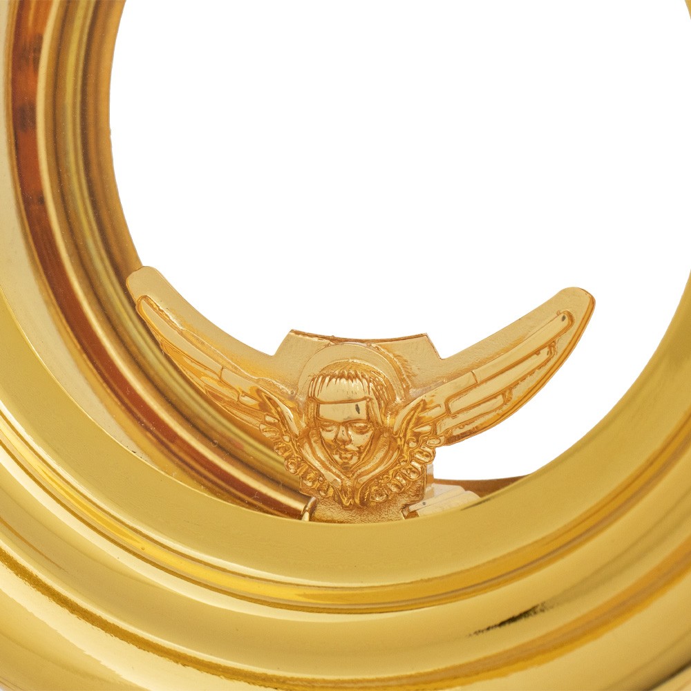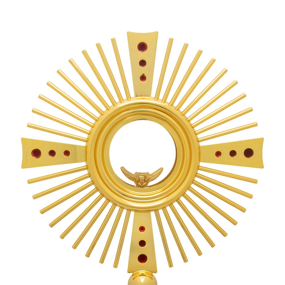 Ostensorio in ottone dorato con base in fusione "Angeli" e pietre rosse, h 18 cm.