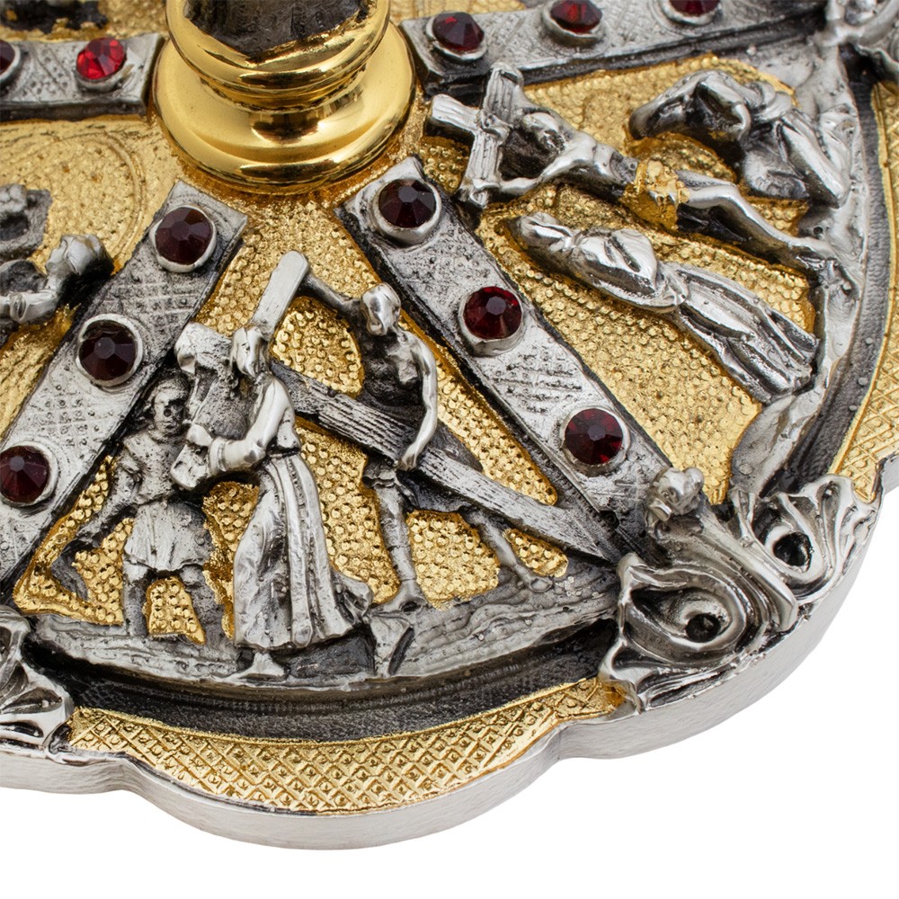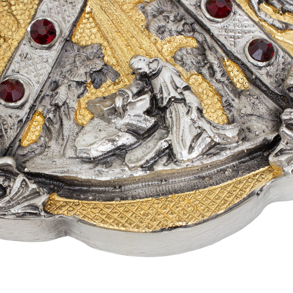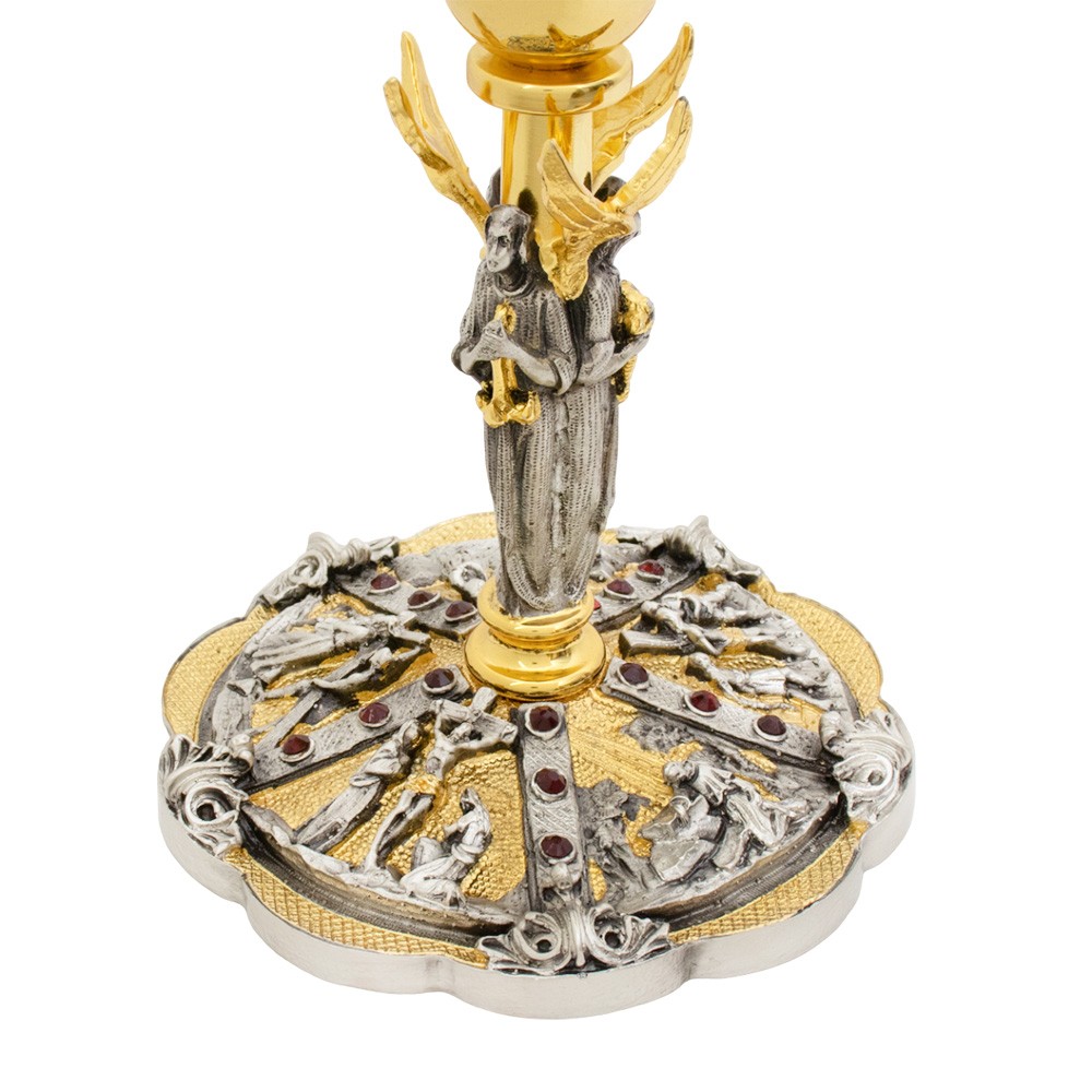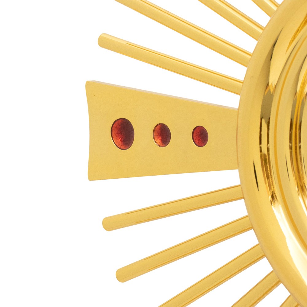 La colonna dell'ostensorio è ornato da angeli in rilievo, mentre sulla raggiera sono distribuite piccole pietre rosse.