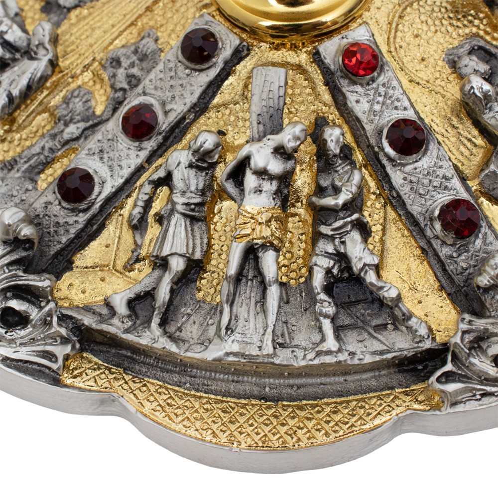 Ostensorio eucaristico in ottone bicolore oro e argento, impreziosito da ricche decorazioni raffiguranti la crocifissione di Gesù.