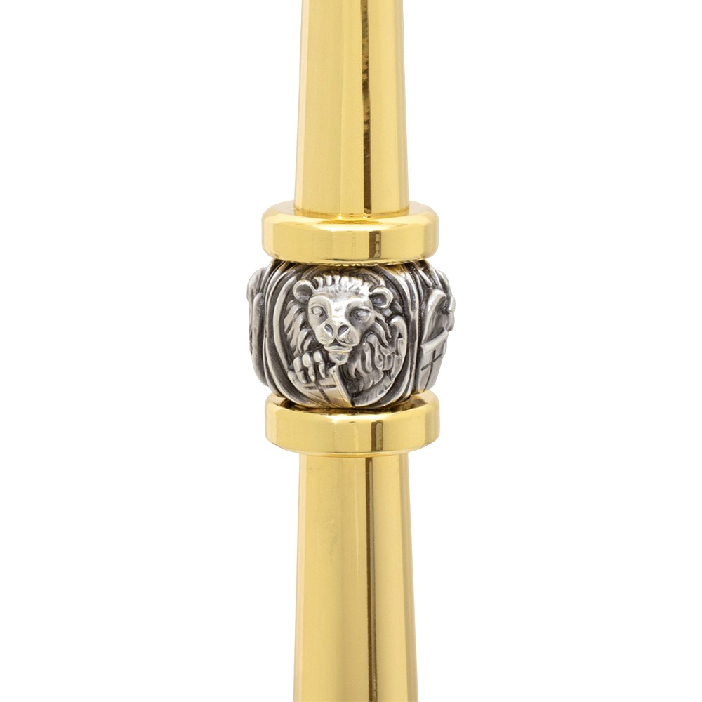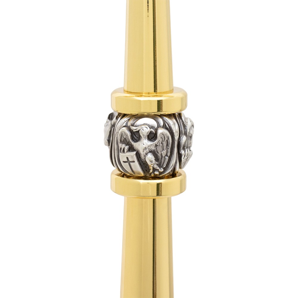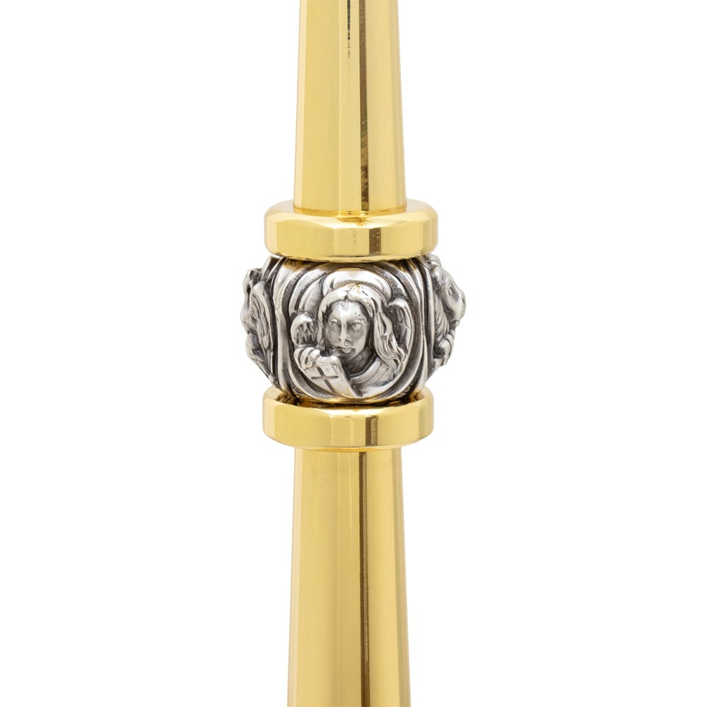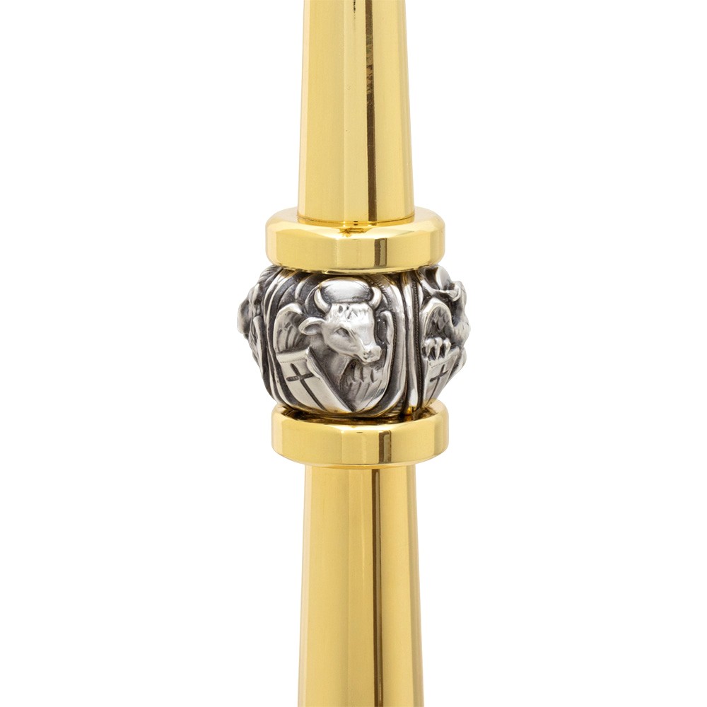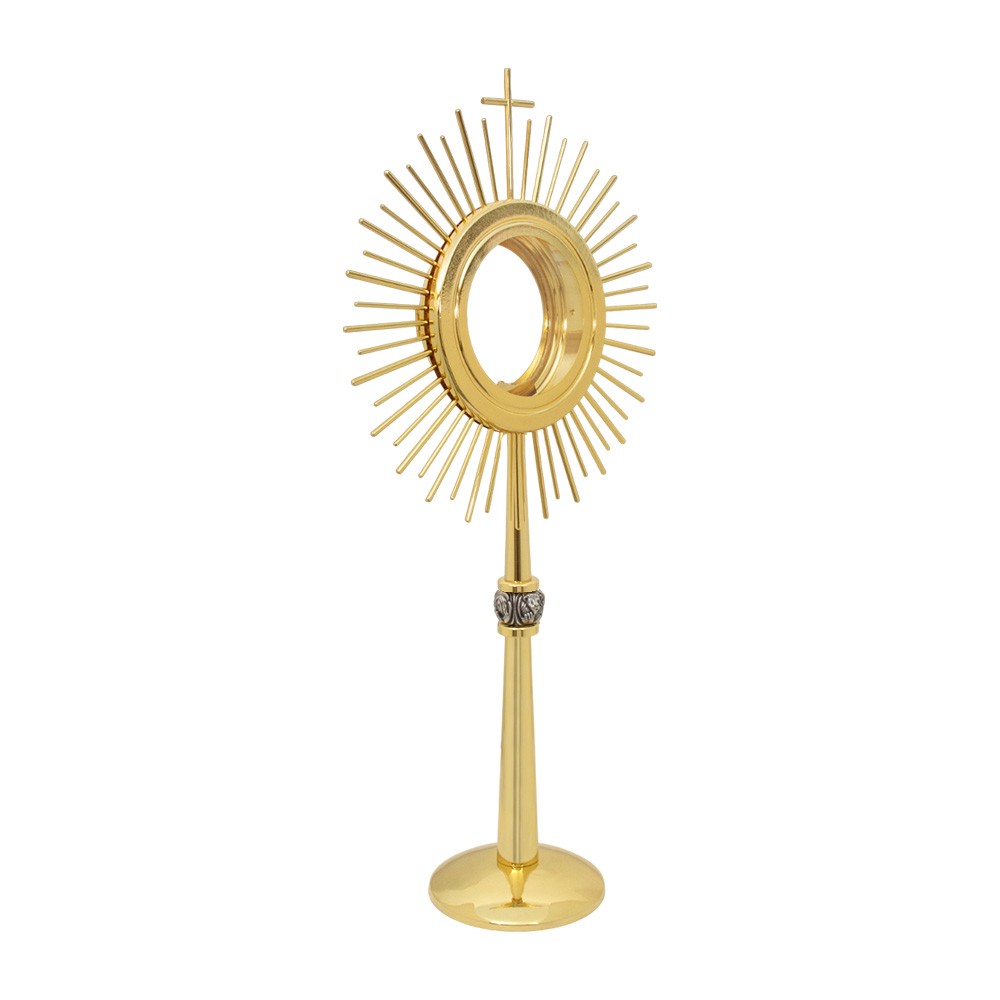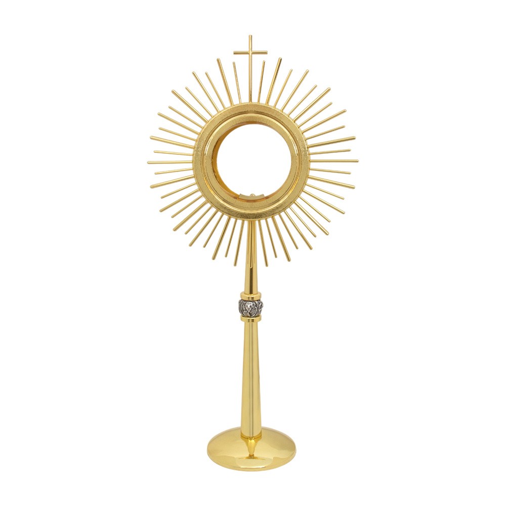L'ostensorio è realizzato interamente in ottone dorato con raggiera, mentre il nodo è in ottone con finitura argentata.