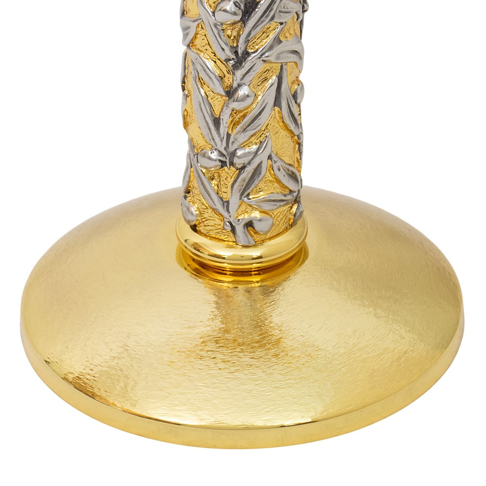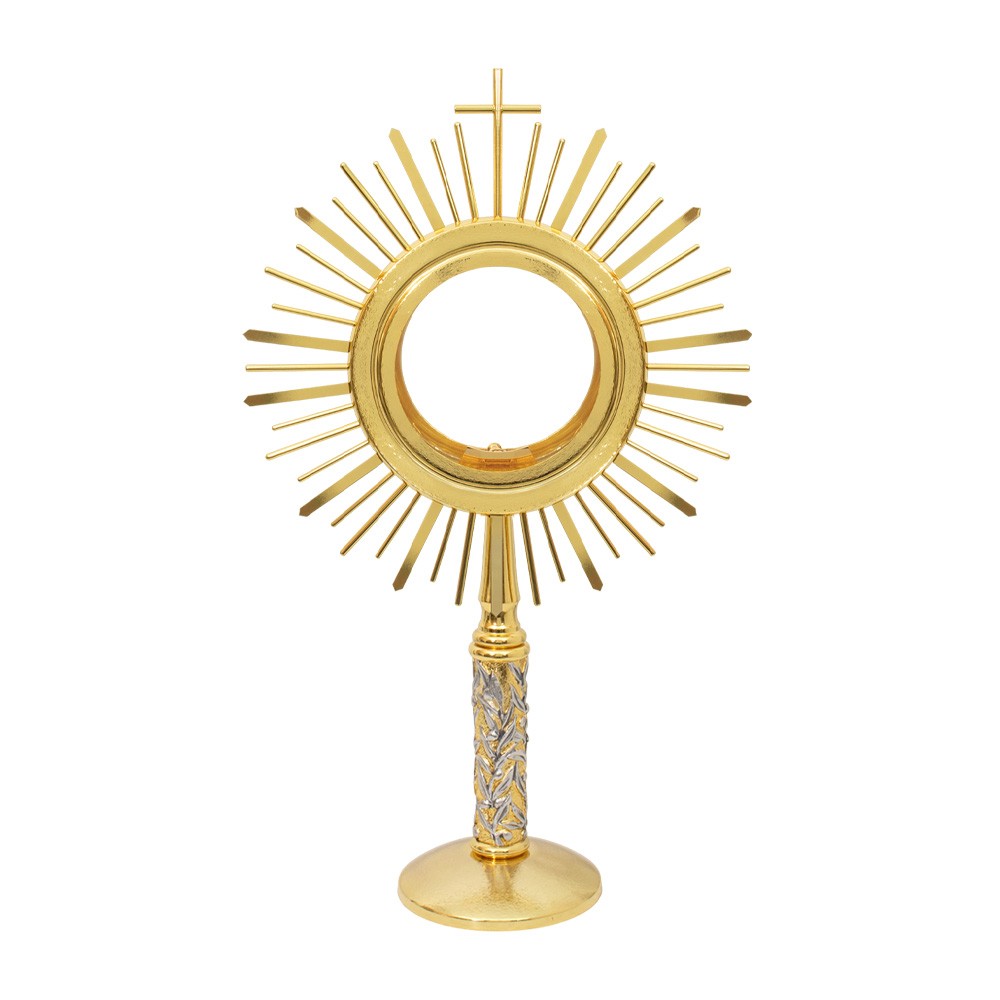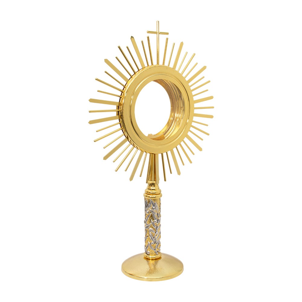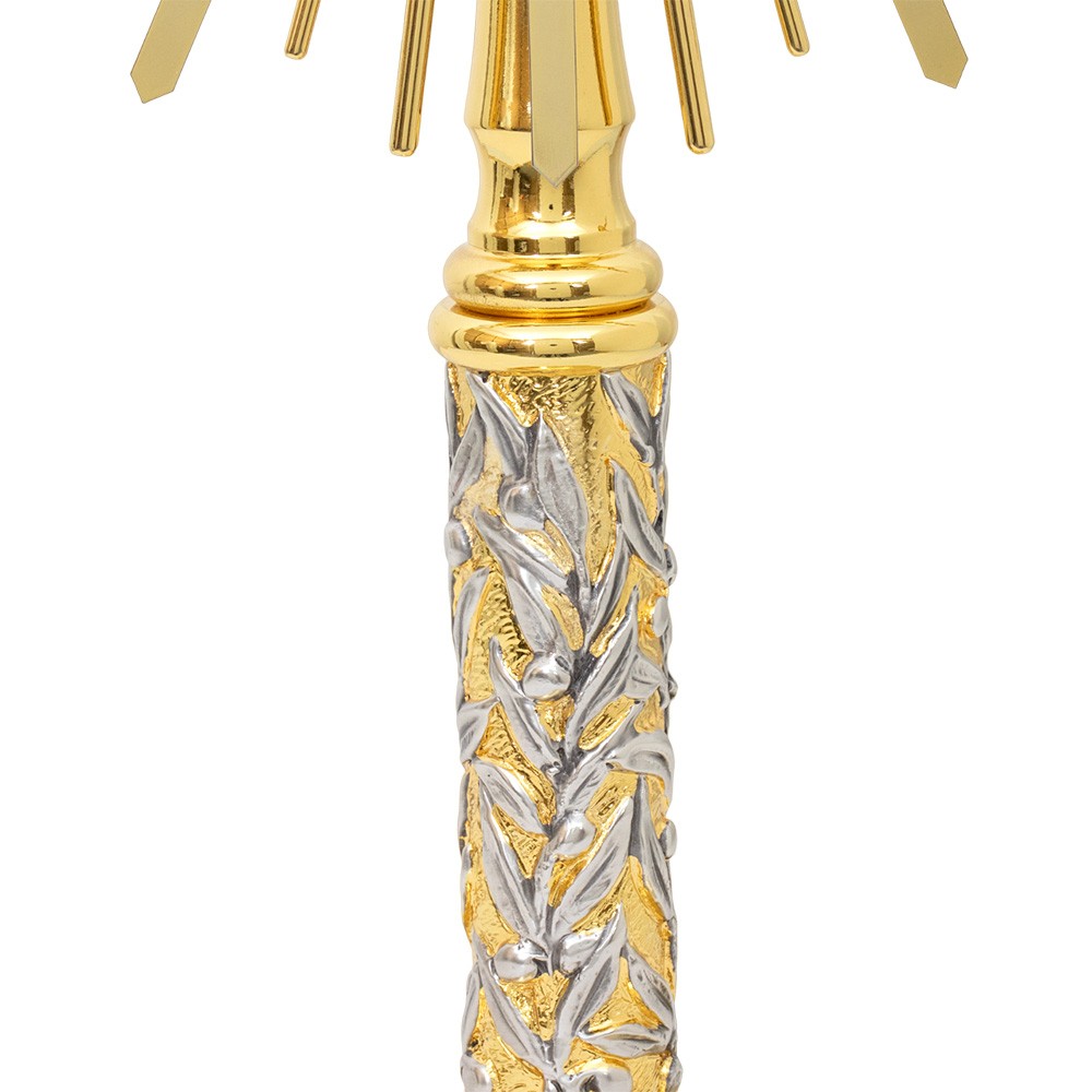L'ostensorio è realizzato interamente in ottone dorato con raggiera, mentre la colonna è finemente decorata con foglie in rilievo con finitura argentata.