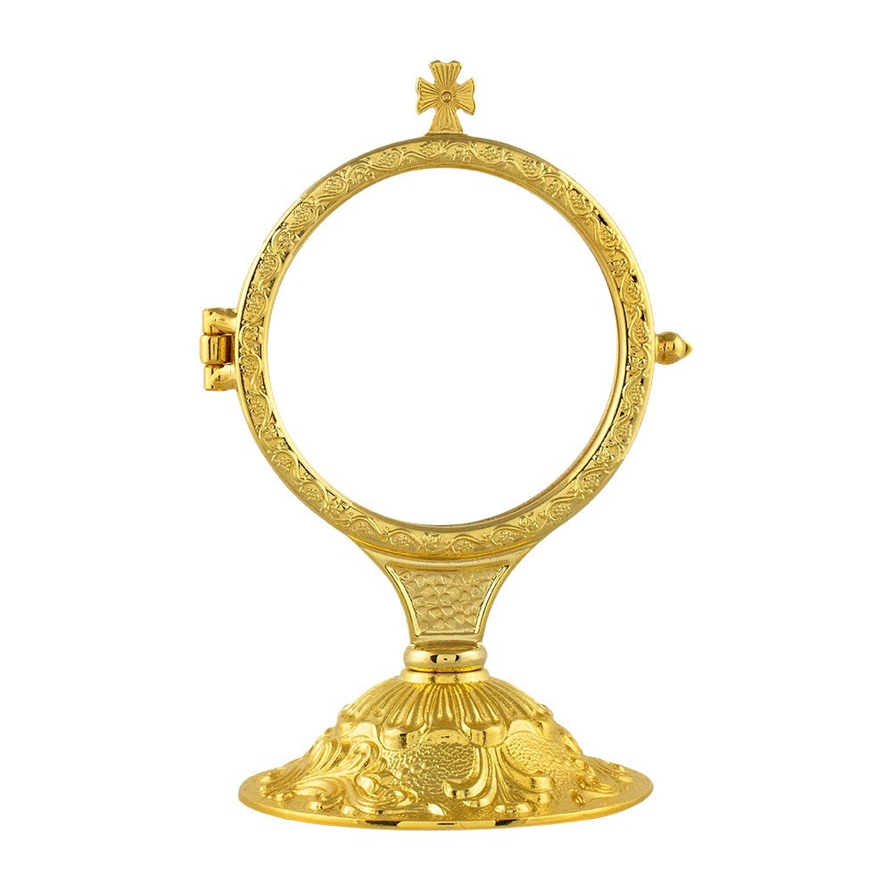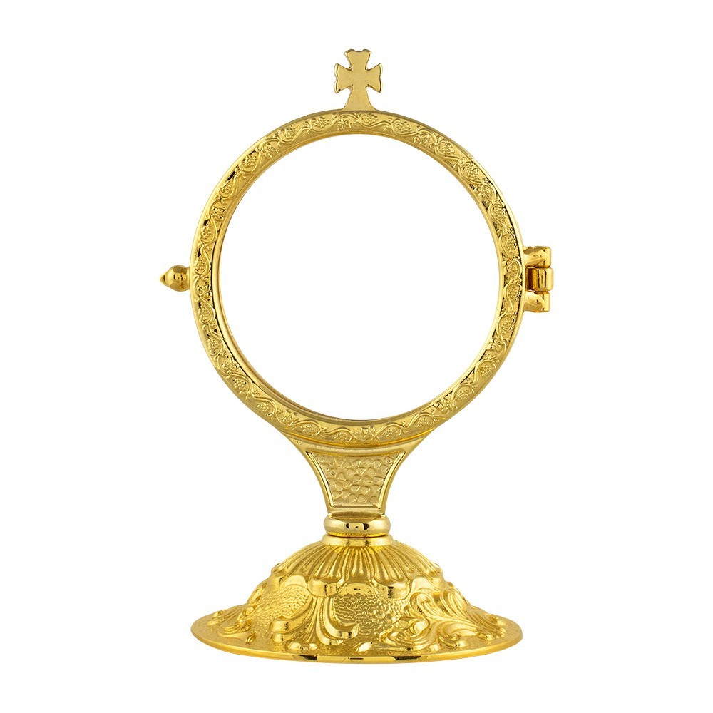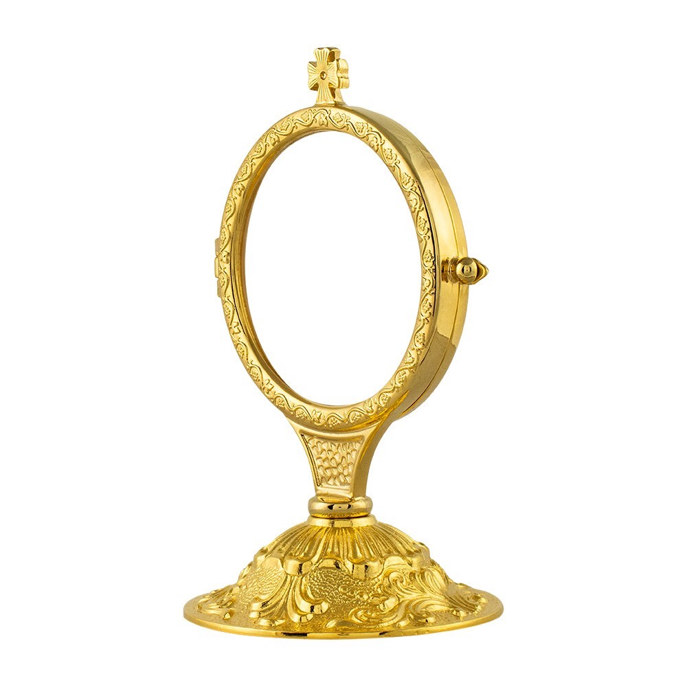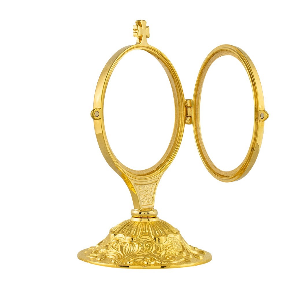 Ostensorio per ostia magna in ottone dorato con tre angeli decorati alla base.