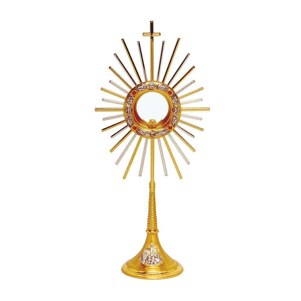 Ostensorio con lunetta in stile moderno in fusione di ottone dorato. I raggi attorno alla teca sono in ottone e si alternano in color oro e argento. Arricchito con graziosi decori che raffigurano i simboli eucaristici e pietre di colore rosso. Articolo di qualità, lavorato e prodotto da un'azienda italiana, con decenni di esperienza nella lavorazione degli arredi sacri.