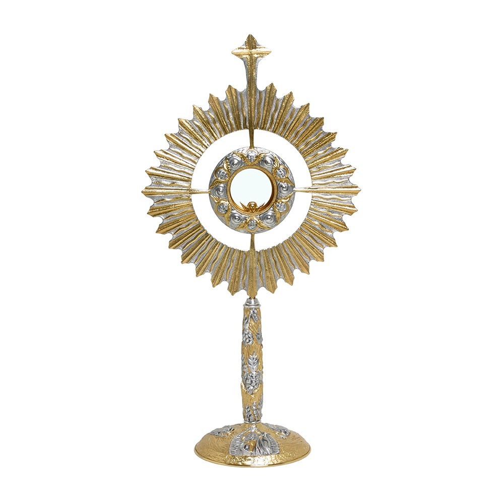 Ostensorio in ottone con finitura argento e oro. Questa teca è alta 70 cm con un diamentro totale 36 cm, è adatta per ostia con diametro 74 mm. Completa di graziose decorazioni e raggiera. Made in Italy.