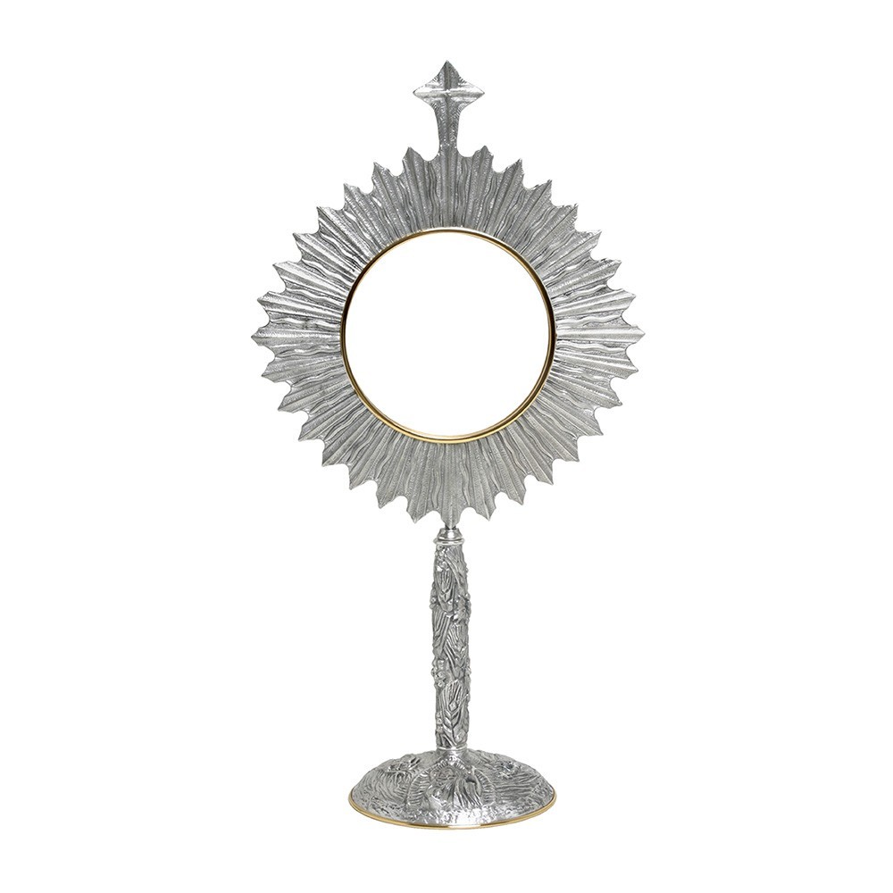 Ostensorio teca da esposizione interamente in ottone con finitura argento. L'ostensorio è alto 70 cm, con un diametro totale 36 cm. Questo arredo sacro è stato prodotto e lavorato da un'azienda italiana, garantendo materiali di prima qualità.