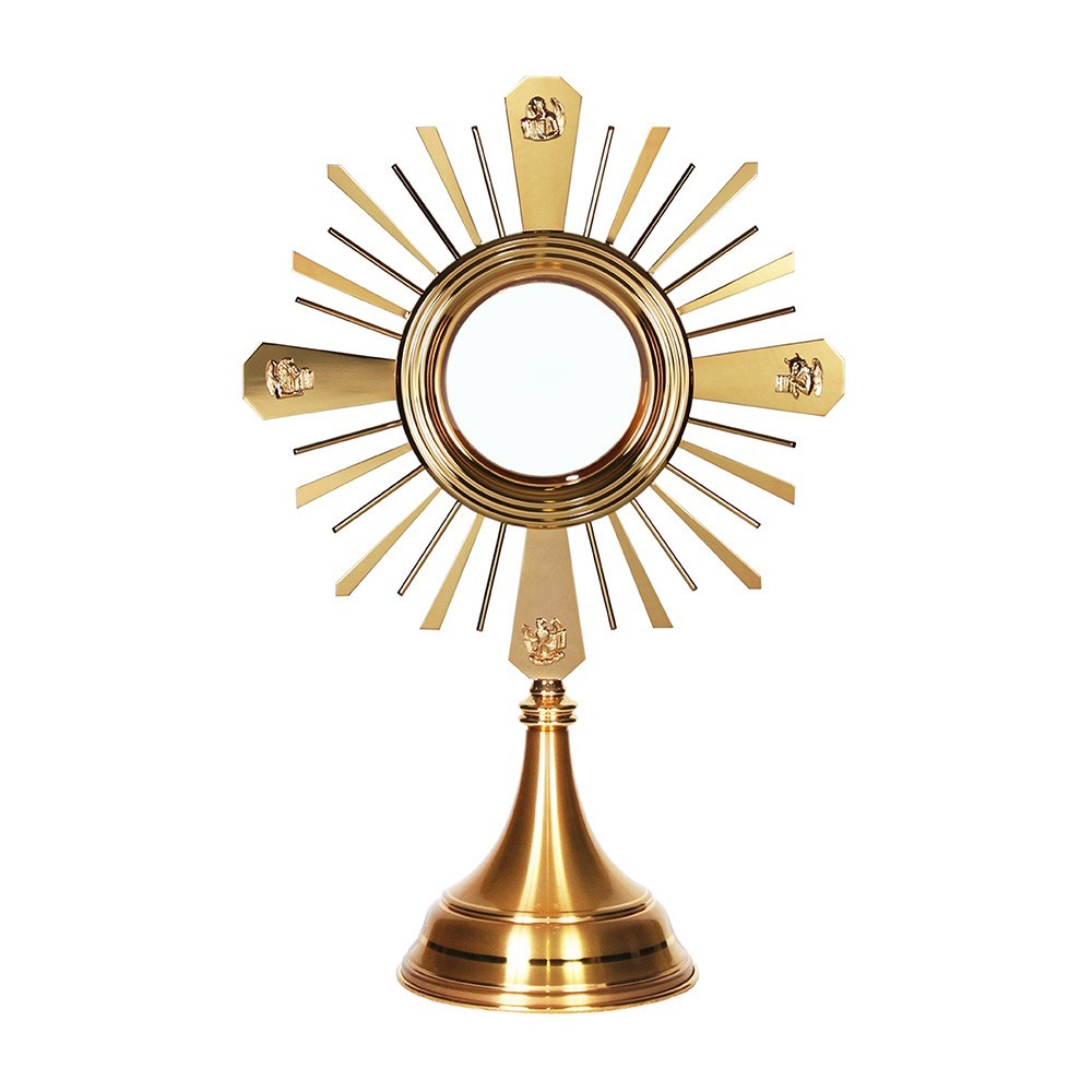 Ostensorio per Ostia magna di diametro massimo 15 cm. Realizzato in ottone bicolore, completo di raggiera e simboli dei quattro evangelisti. Articolo ideato e realizzato da un'azienda italiana, con decenni di esperienza nella lavorazione di arredi sacri.