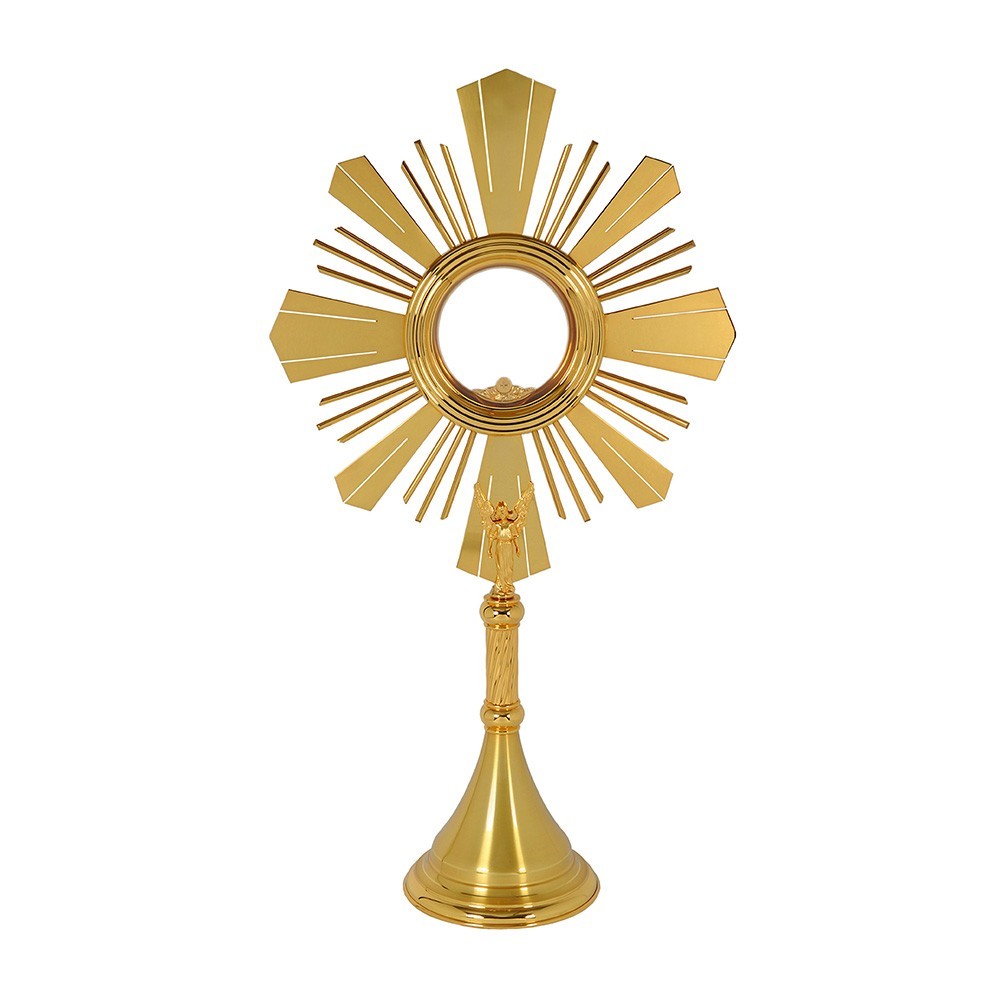 Ostensorio (alto 76 cm) realizzato in ottone dorato con finitura sia lisca che satinata. Completa di raggiera e angelo. Questo arredo sacro è realizzato interamente da un'azienda italiana. Articolo di qualità, 100% italiano.
